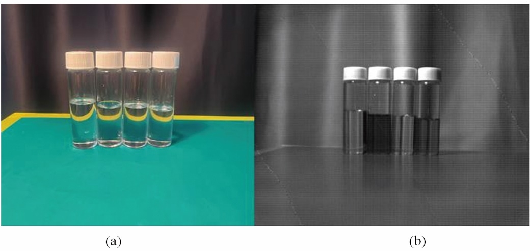 The typical application of SWIR camera in the field of "material perception" can be intuitively demonstrated through the liquid sorting scenario: the four transparent liquids in the experiment are trichloroethylene, deionized water, polycarboxylate superplasticizer and bis (p-chlorophenyl) trichloroethane. Under the visible light imaging perspective, they cannot be distinguished because they are all transparent. However, when the quantum dot SWIR camera is switched to imaging (see Figure3 (b) ) , due to the differences in molecular structure of different liquids, the absorption capacity of liquids to SWIR light is different. This absorption difference is directly converted into significantly different gray values in the image, which ultimately makes the four liquids that were originally difficult to distinguish clear and provides precise technical support for efficient sorting [48].