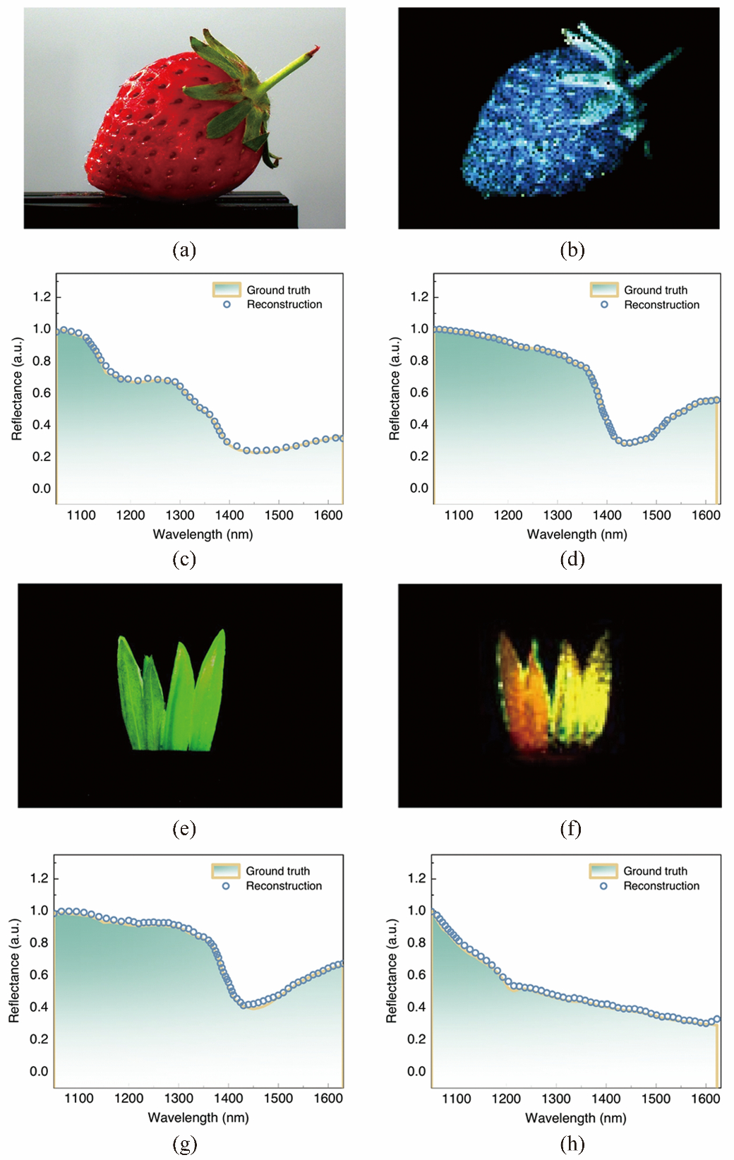 Fig.4: Hyperspectral images of reflective objects: (a) Color photograph of fresh strawberry; (b) Hyperspectral image of fresh strawberry; (c) - (d) Reconstructed reflectance spectra of strawberry pulp and strawberry calyx; (e) - (f) Color photograph of a mixture of real grass and plastic grass; (h) Hyperspectral image of plastic grass; (g) Reconstructed reflectance spectrum of real grass [49].