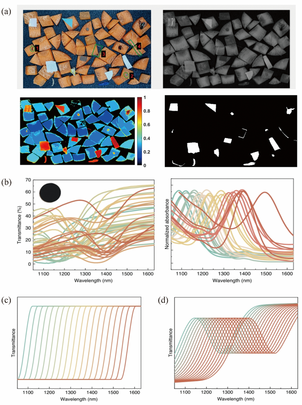 Fig.5: (a) Detection of foreign matter in fresh sliced carrots [51]; (b) Transmission spectrum of the filter and absorption spectrum of lead sulfide quantum dots in solution [52-53]; (c) - (d) Comparison of transmission spectra of traditional stepped filter and CQD filter [54].