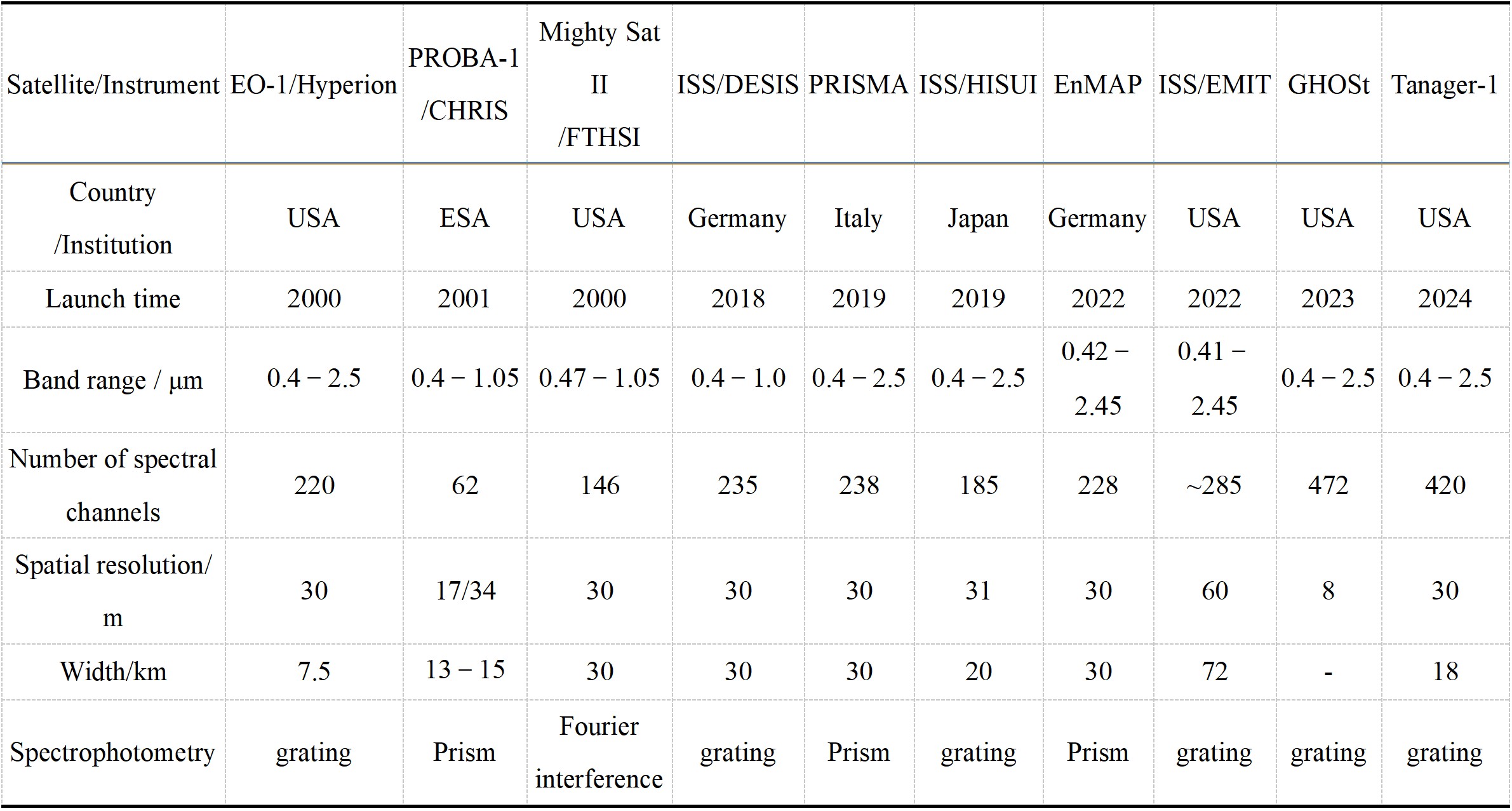 Key indicators of representative early and current near-infrared/hyperspectral earth imaging payloads from abroad