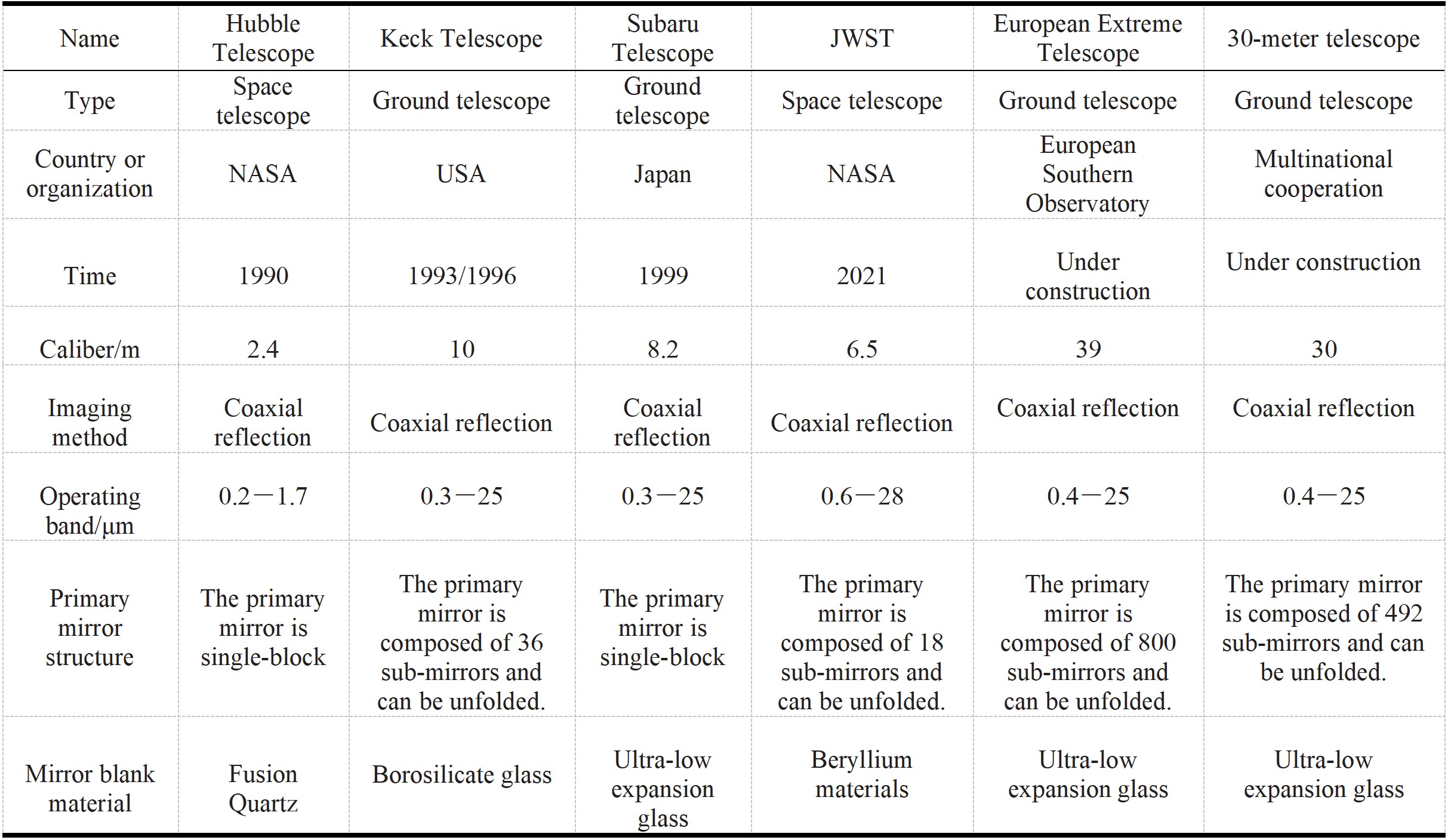 Key Indicators of Typical Large-Aperture Telescopes Abroad