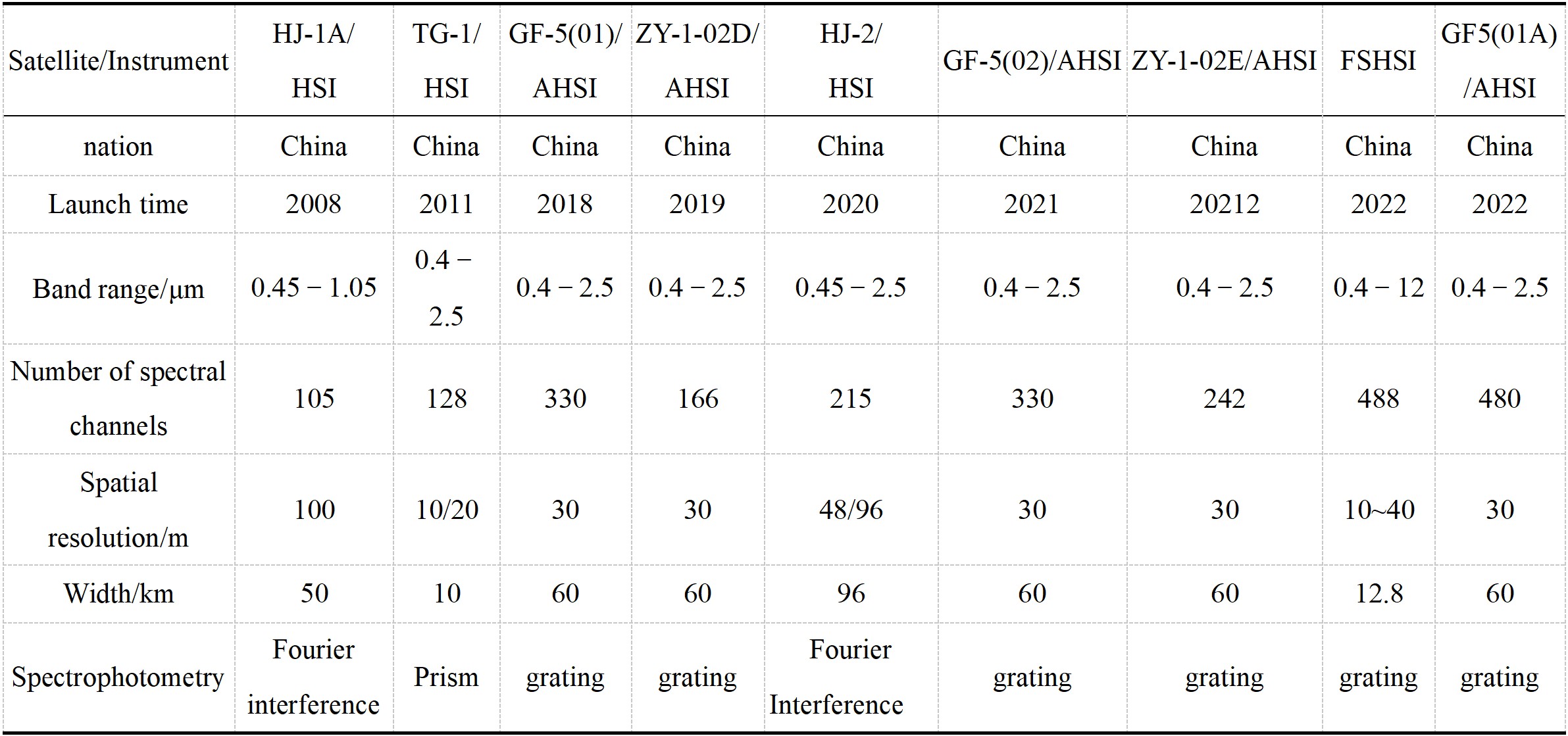 In 2000, the US EO-1 satellite carried the Hyperion infrared hyperspectral imaging Earth observation payload, which combines high spatial resolution and high spectral resolution, covering a wavelength range of 0.4–2.5 nm with a width of only 7.5 μm. The signal-to-noise ratio in the short-wave infrared band is low. Subsequent developments of spaceborne hyperspectral cameras, both domestically and internationally, only extended to approximately 1.0 μm in the near-infrared region. China's Gaofen-5(GF-5) satellite, launched in 2018, carried the world's first spaceborne wide-spectrum, wide-swath hyperspectral imager—AHSI(operating from 0.4 to 2.5 μm with a swath width of 60 km). Subsequently, Europe and the United States successively launched spaceborne hyperspectral imagers with spectral coverage also spanning 0.4–2.5 μm(swath width ≤ 30 km at 30 m spatial resolution). In 2023, China launched the world's first hyperspectral imager with a spectral range covering 0.4–12.5 μm(spatial resolution: 10 m/40 m). Tables 4 and 5 list the key specification data of representative early and current near-infrared/infrared hyperspectral Earth imaging payloads developed domestically and abroad, respectively.