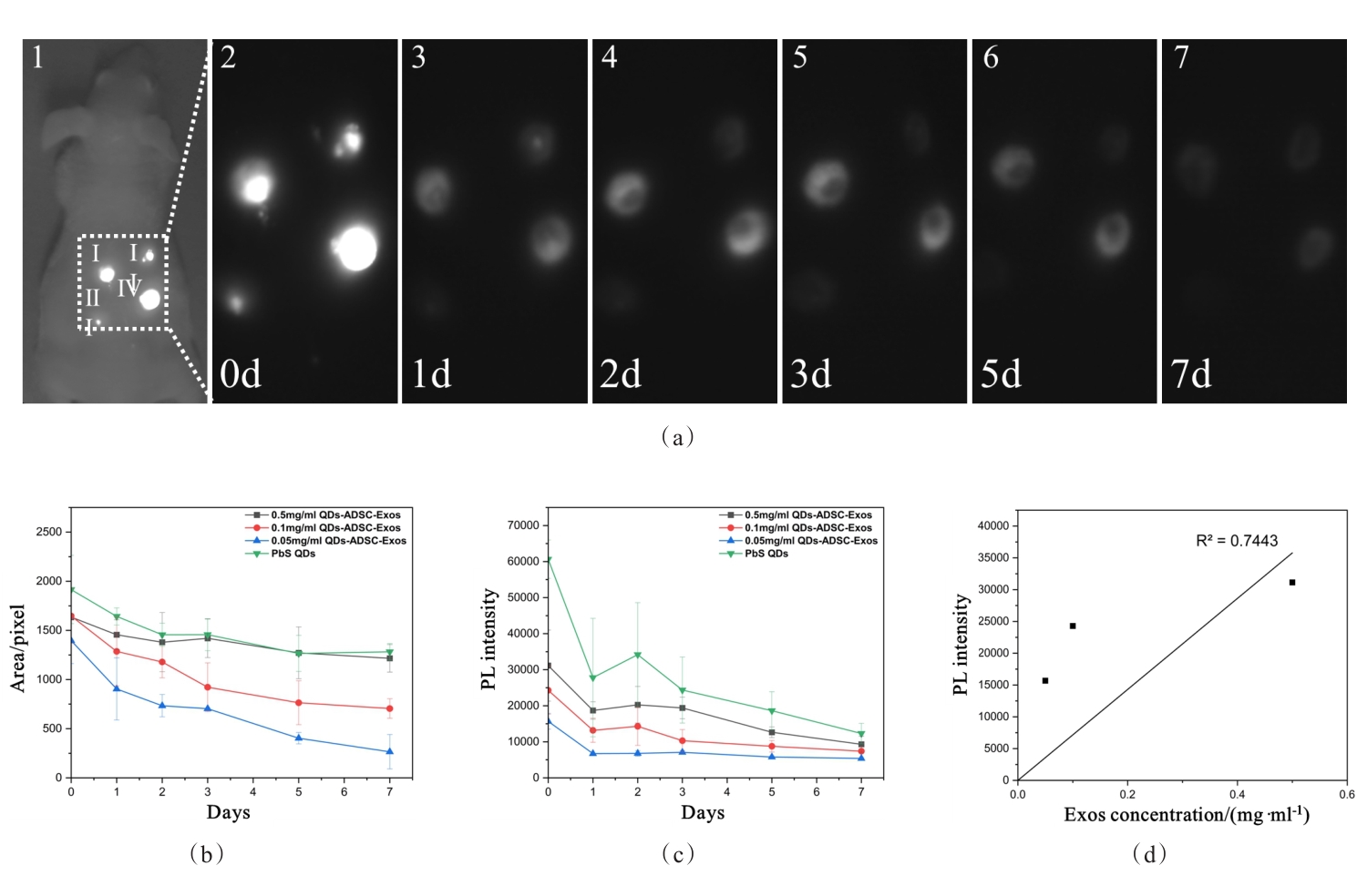 摘要:缺血是影响周围神经损伤修复的重要因素,而外泌体被证实具有促血管再生作用。为了进一步研究外泌体治疗伴缺血周围神经损伤的细节过程与疗效,本文利用葡萄糖修饰近红外二区量子点标记脂肪干细胞来源外泌体(QDs-ADSC-Exos),实现外泌体治疗伴缺血周围神经损伤的活体近红外二区(NIR-II)长时程成像。实验结果证实量子点可用于体外无创标记外泌体,QDs-ADSC-Exos在NIR-II区间下显示出高强度荧光信号,在体内具备良好的NIR-II活体成像特性;QDs-ADSC-Exos在伴缺血周围神经损伤中表现为在神经损伤局部的聚集;神经功能学评估果表明,QDs-ADSC-Exos能促进有效神经功能再生。本研究证明外泌体在伴缺血周围神经损伤治疗中的潜力,也发现外泌体治疗伴缺血周围神经损伤的时空变化特征,为了进一步优化外泌体治疗方案提供了客观依据。