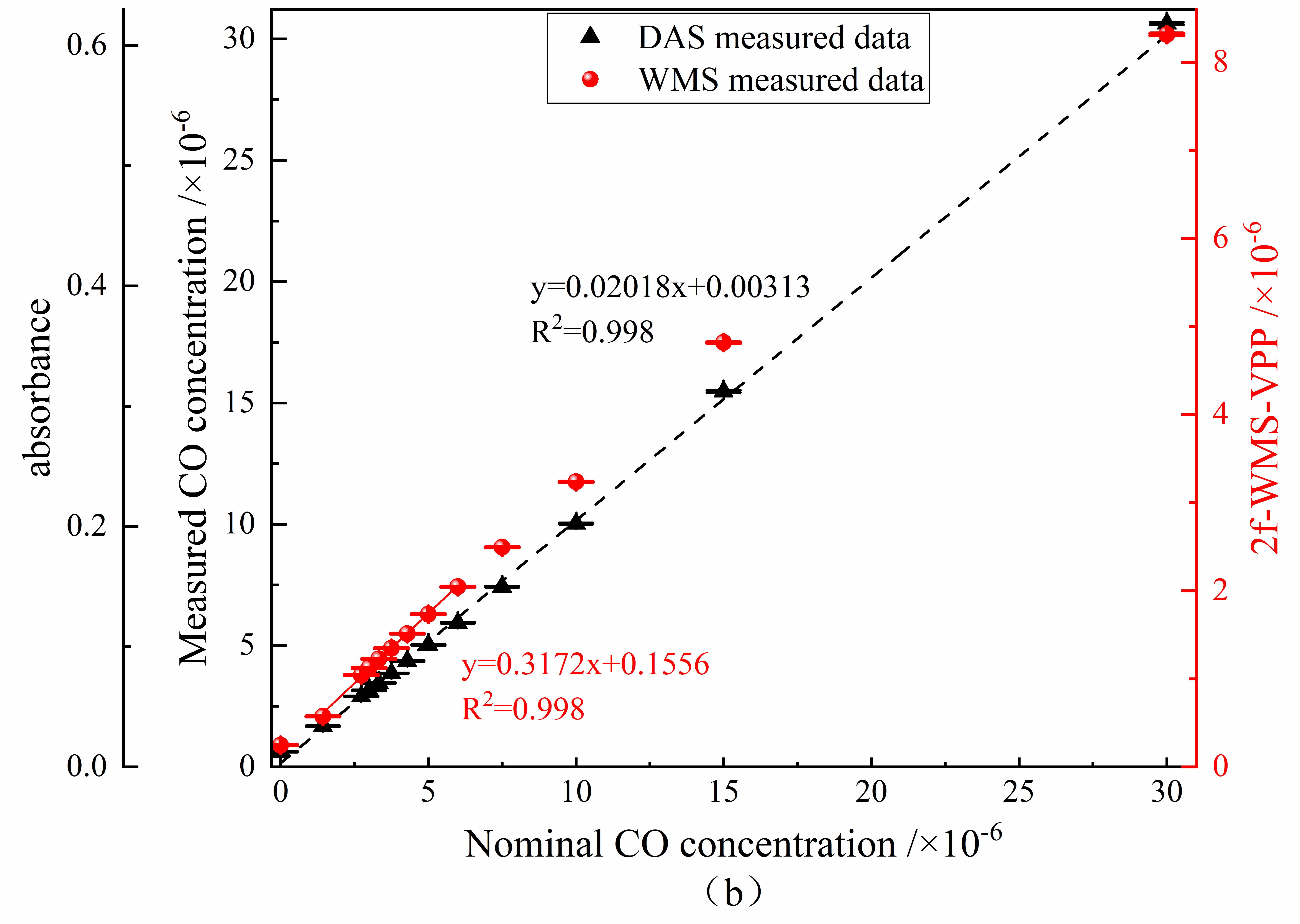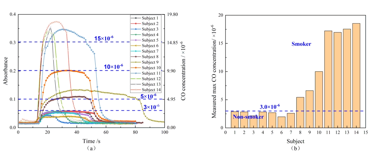 摘要:呼气CO浓度作为一些疾病诊断的标志物备受关注,目前CO浓度检测仪存在灵敏度低,响应时间慢的问题。因此采用中心波长为4.59 μm的量子级联激光器和3.8 m多通池搭建一套基于吸收光谱技术的灵敏度高、响应时间快的呼气CO测量系统。采用直接吸收(DAS)和波长调制(WMS)技术对CO浓度检测分析,得到DAS的线性度为0.998,检测限可达3.68×10-8(体积比);WMS技术检测在CO浓度小于6.00×10-6的线性度为0.998,检测限可达3.00×10-9。通过Allan方差分析获得了DAS和WMS的最佳积分时间分别为170 s和250 s,对应的探测极限分别为2.00×10-9和3.00×10-10。最后对14个志愿者进行呼气CO检测,结果表明可以很好区分吸烟者和非吸烟者,为戒烟门诊判断吸烟者情况提供了科学有效的工具。