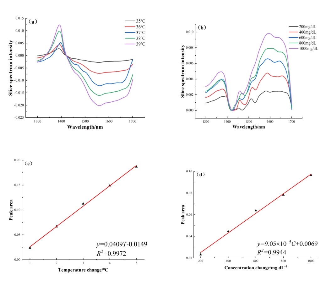 摘要:近红外光谱属于分子振动光谱,溶液温度变化会造成O-H等分子振动及氢键等分子间作用力改变,进而引起吸收光谱的强度及谱峰变化,影响血糖等微弱成分检测精度。为解决温度扰动对于光谱检测及建模分析的影响,提出一种基于水光谱组学与双光谱二维相关光谱(2T2D-COS)的温度扰动判别方法。对仿体溶液在温度扰动及葡萄糖浓度扰动下的漫反射吸收光谱进行2T2D-COS分析,提取温度和糖浓度变化造成的光谱变化特征,得到不同扰动下的水光谱模式。实验结果表明,温度变化0.1 ℃与葡萄糖浓度变化45 mg/dL强度相当。进一步建立基于原始光谱、水光谱特征和2T2D-COS异步谱的温度扰动异常光谱判别模型,其中基于2T2D-COS异步谱特征的判别模型准确率达到95.83%,剔除异常样本后葡萄糖浓度预测均方根误差降低了51.89%,为提高近红外光谱在体血糖检测的精度提供了基础。