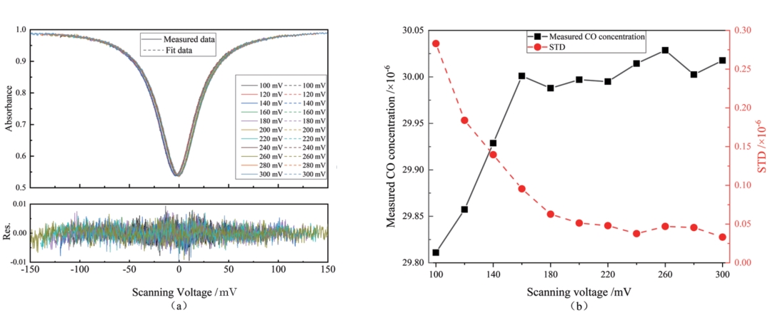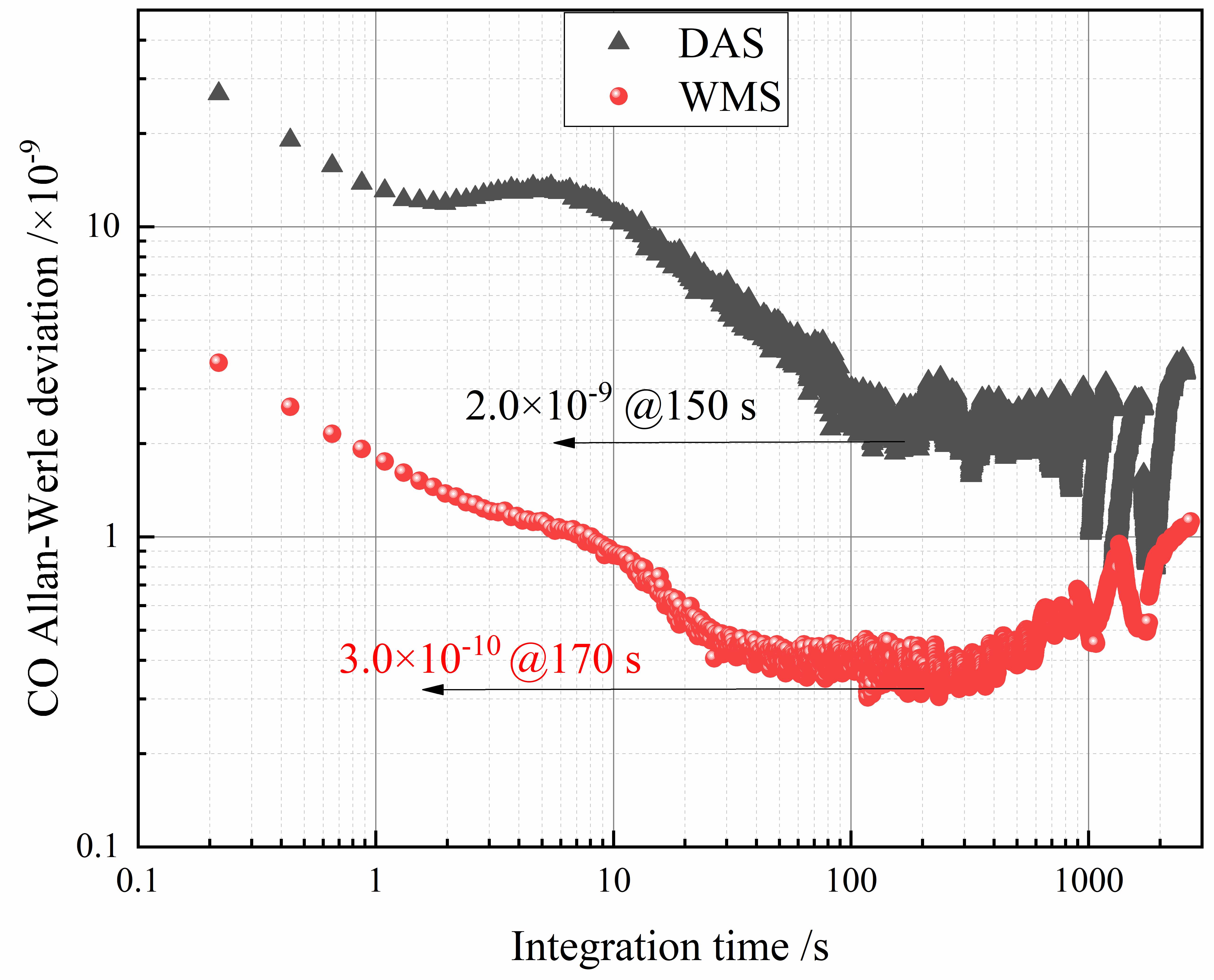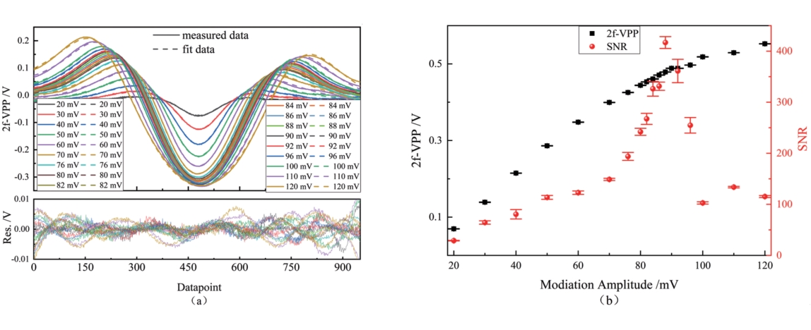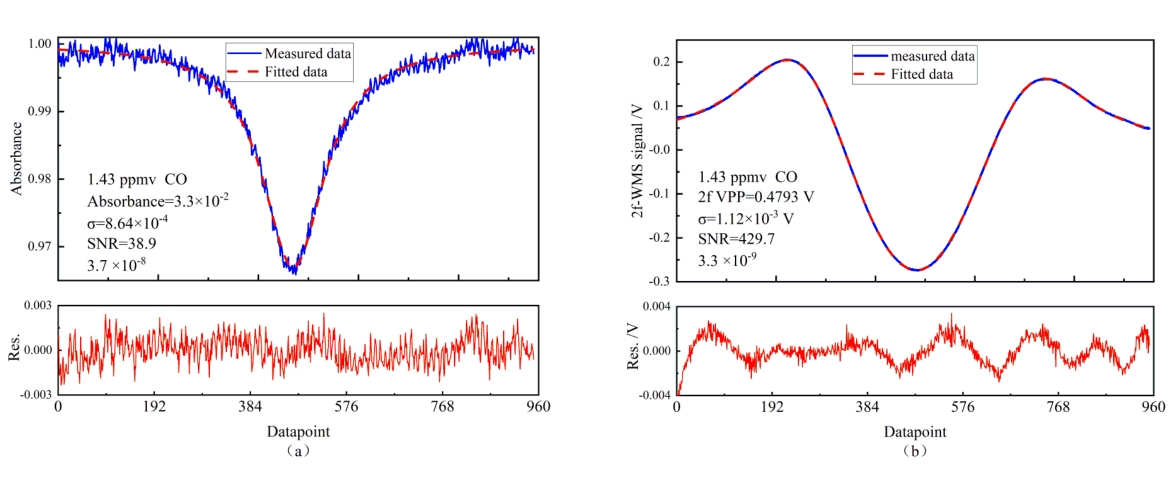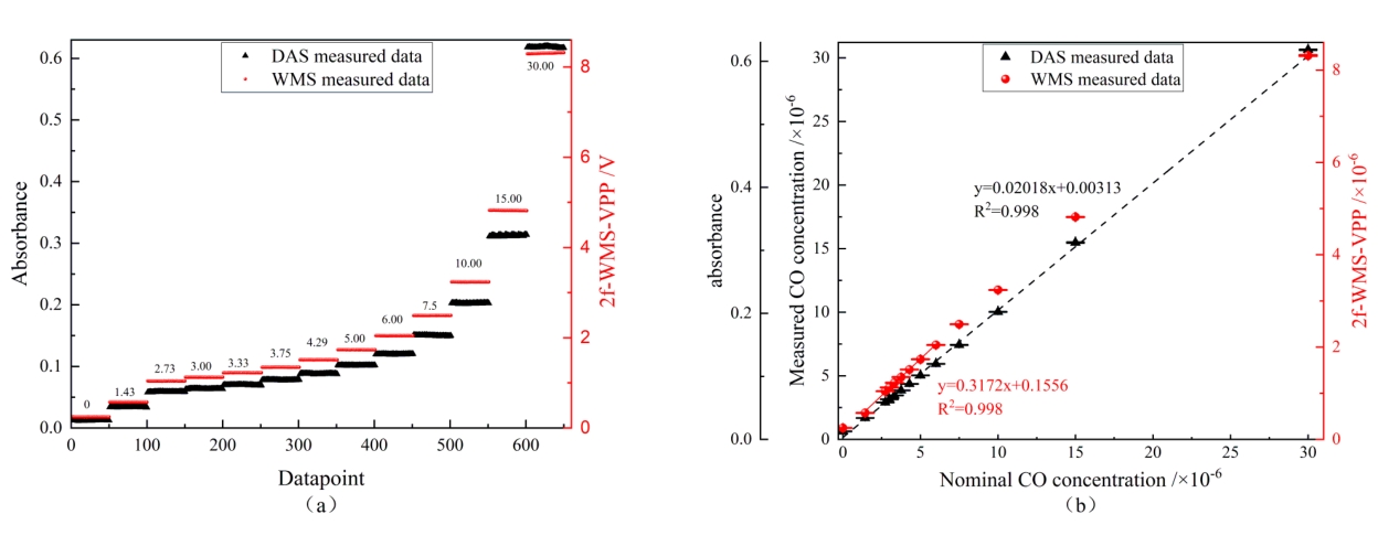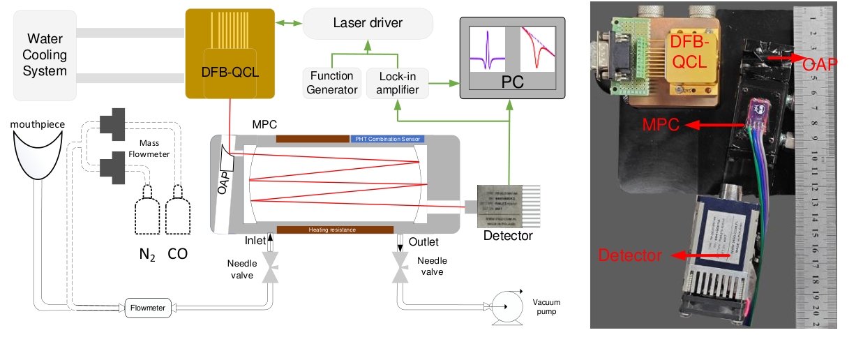 摘要:呼气CO浓度作为一些疾病诊断的标志物备受关注,目前CO浓度检测仪存在灵敏度低,响应时间慢的问题。因此采用中心波长为4.59 μm的量子级联激光器和3.8 m多通池搭建一套基于吸收光谱技术的灵敏度高、响应时间快的呼气CO测量系统。采用直接吸收(DAS)和波长调制(WMS)技术对CO浓度检测分析,得到DAS的线性度为0.998,检测限可达3.68×10-8(体积比);WMS技术检测在CO浓度小于6.00×10-6的线性度为0.998,检测限可达3.00×10-9。通过Allan方差分析获得了DAS和WMS的最佳积分时间分别为170 s和250 s,对应的探测极限分别为2.00×10-9和3.00×10-10。最后对14个志愿者进行呼气CO检测,结果表明可以很好区分吸烟者和非吸烟者,为戒烟门诊判断吸烟者情况提供了科学有效的工具。