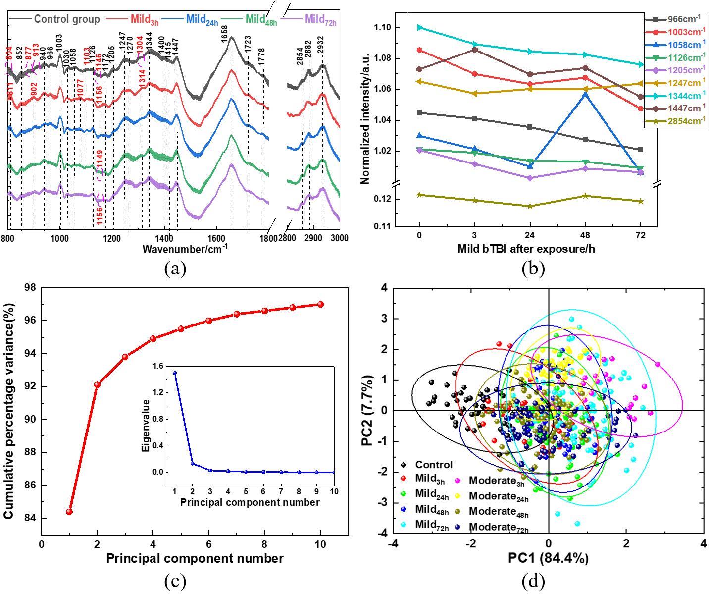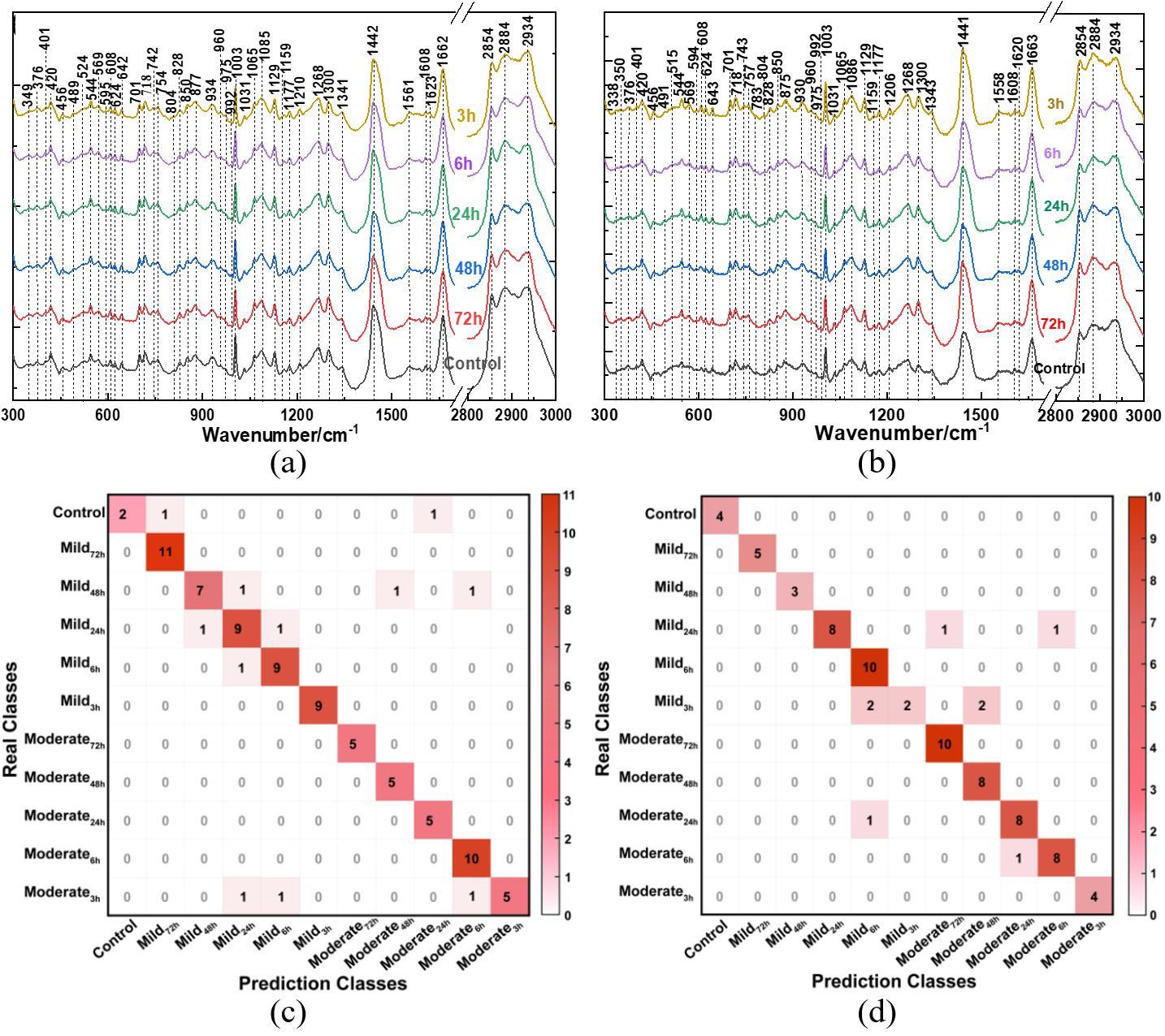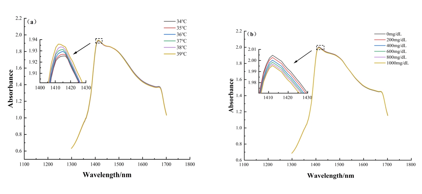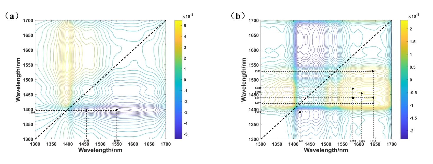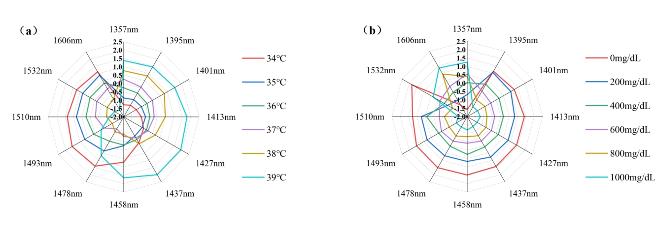 摘要:近红外光谱属于分子振动光谱,溶液温度变化会造成O-H等分子振动及氢键等分子间作用力改变,进而引起吸收光谱的强度及谱峰变化,影响血糖等微弱成分检测精度。为解决温度扰动对于光谱检测及建模分析的影响,提出一种基于水光谱组学与双光谱二维相关光谱(2T2D-COS)的温度扰动判别方法。对仿体溶液在温度扰动及葡萄糖浓度扰动下的漫反射吸收光谱进行2T2D-COS分析,提取温度和糖浓度变化造成的光谱变化特征,得到不同扰动下的水光谱模式。实验结果表明,温度变化0.1 ℃与葡萄糖浓度变化45 mg/dL强度相当。进一步建立基于原始光谱、水光谱特征和2T2D-COS异步谱的温度扰动异常光谱判别模型,其中基于2T2D-COS异步谱特征的判别模型准确率达到95.83%,剔除异常样本后葡萄糖浓度预测均方根误差降低了51.89%,为提高近红外光谱在体血糖检测的精度提供了基础。