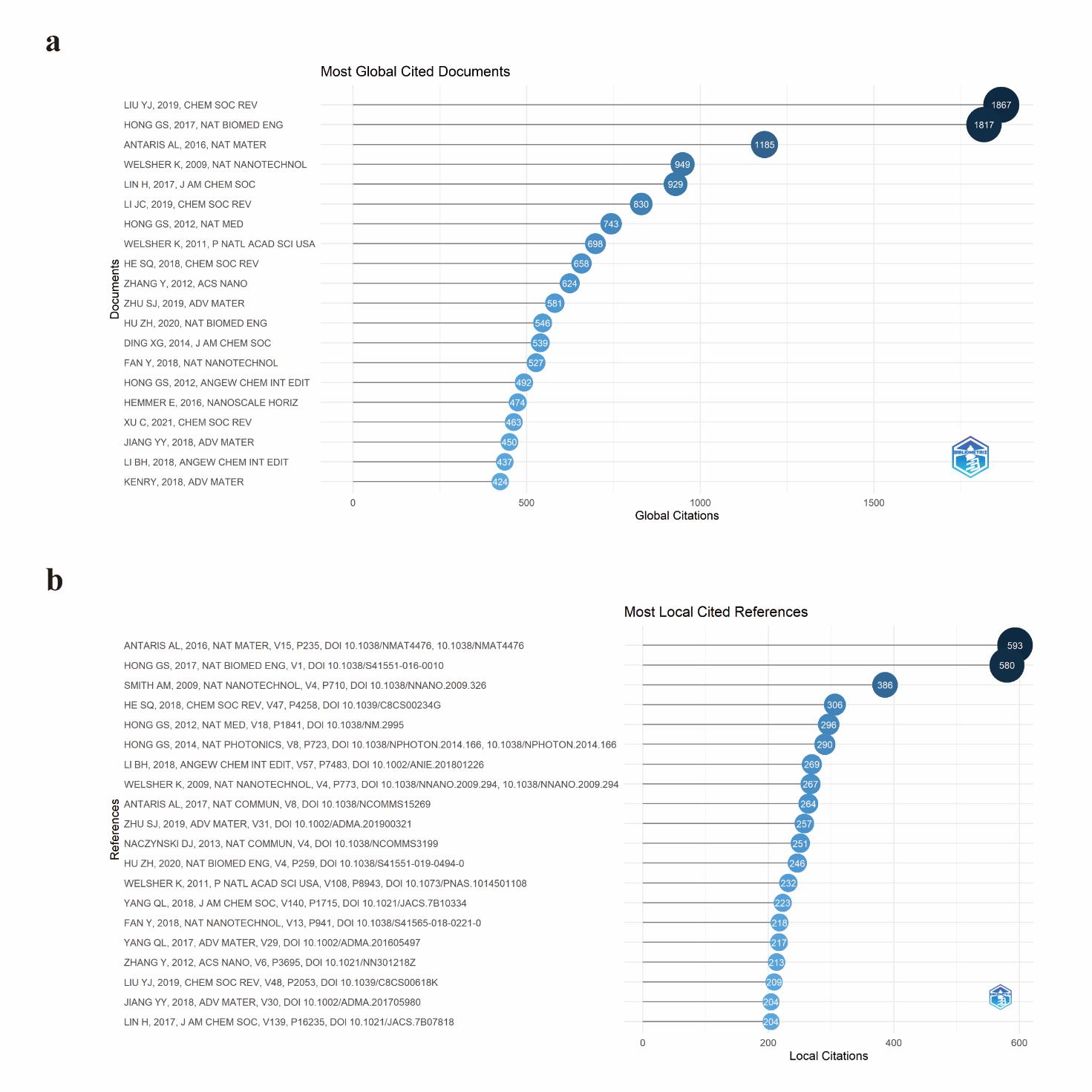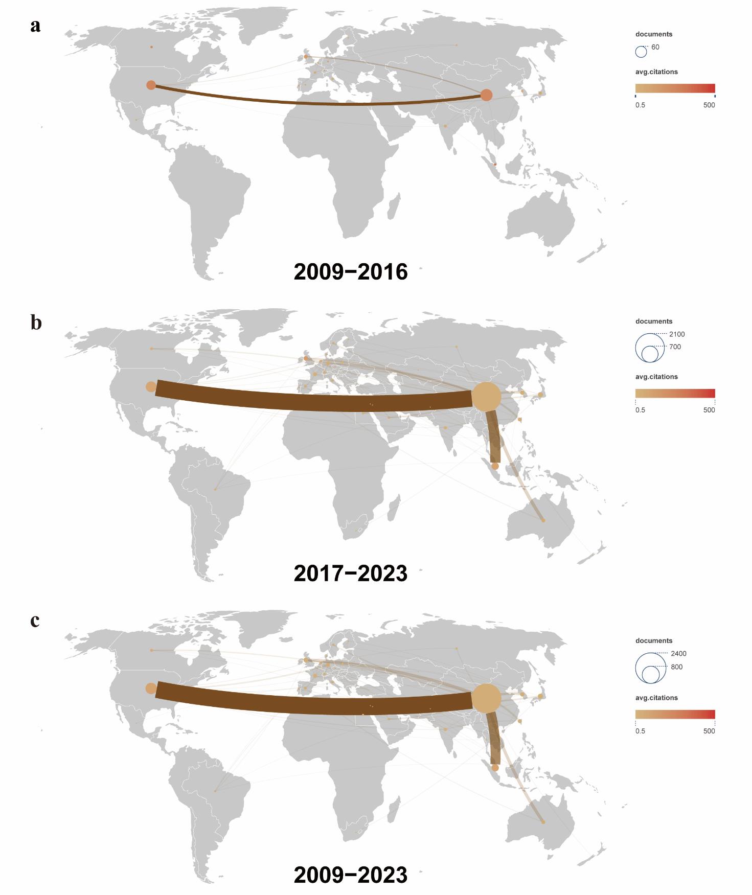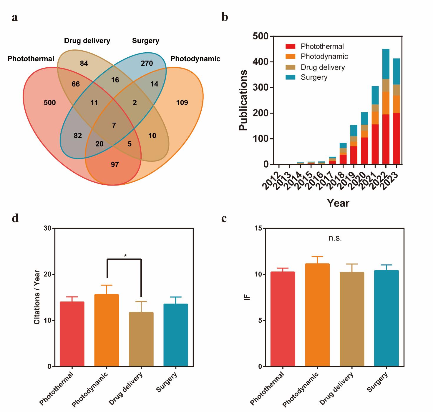 摘要:近红外二区(NIR-II,900~1 880 nm)克服了可见光(360~760 nm)和近红外一区(760~900 nm)成像的关键局限性,包括受限的穿透深度、低信噪比和高组织自发荧光,确立了其在体内深部组织生物成像中的关键作用。随着近红外二区光诊断和光疗研究在过去十年中呈指数级增长,文献计量分析对于绘制不断变化的格局和指导战略重点至关重要。我们系统地分析了来自Web of Science核心合集的2491篇与NIR-II相关的出版物(2009~2023),采用科学计量工具进行不同的分析目的:(a)VOSviewer、SCImago Graphica和Gephi用于合著和共现网络映射;(b)R bibliometrix包,用于跟踪领域演变和识别高影响力出版物/期刊。该搜索从来自54个国家的359种期刊中检索到2 491项研究。发表文章最多的国家是中国。中国机构推动了超过60%的出版物,斯坦福大学(美国)和南洋理工大学(新加坡)在研究质量方面排名前两位。国际合作日益频繁。范曲立、唐本忠、戴洪杰是该领域三位最具生产力的作家。关键词进化将“光动力疗法”和“免疫疗法”确定为未来的关键方向。我们总结了被引用最多的文献和NIR-II成像相关临床研究。本研究描绘了NIR-II的研究轨迹,突出了中国的领导地位、加强全球合作和跨学科融合。未来的工作应优先考虑新型NIR-II探针的开发,用于NIR-II成像和光动力/免疫治疗组合平台的临床转化。