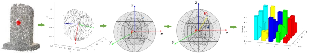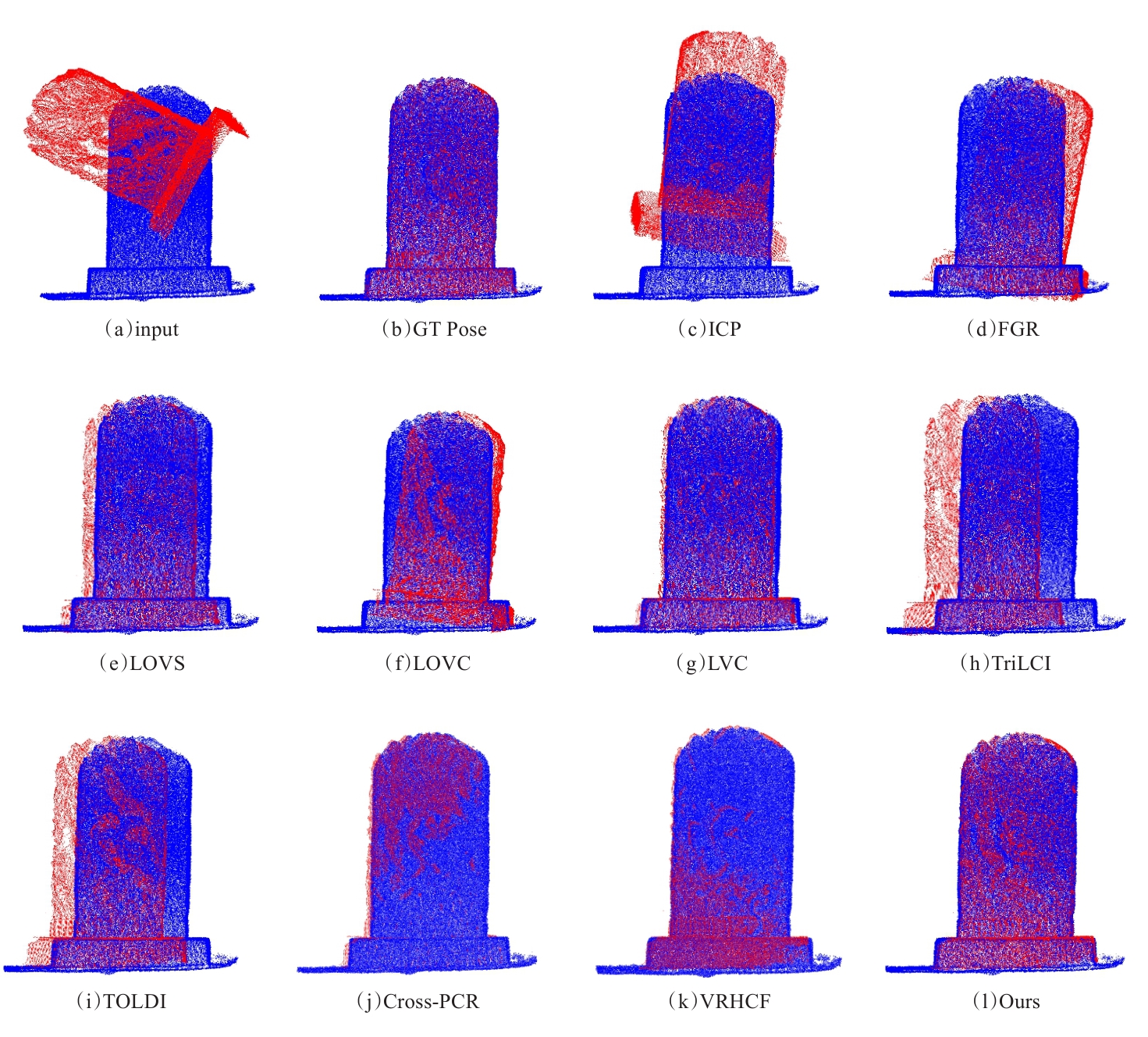 Abstract:To address the registration challenges caused by cross-source point cloud quality disparities, this paper proposes an improved spherical voxel local shape descriptor (Spherical Voxel Center Descriptor, SVCD) for cross-source point cloud registration. SVCD effectively mitigates density and distribution variations through dual-weighted Local Reference Frame (LRF) computation and spherical voxel segmentation. Its core innovation lies in feature encoding based on the distance from voxel centers to keypoints, enhancing the distinctiveness and robustness of the descriptor. The registration process establishes correspondences via the nearest neighbor similarity ratio and solves the rigid transformation using the singular value decomposition. Experimental results on the 3DCSR and real-world datasets demonstrate that SVCD achieves a registration error as low as 0.004 8, with recall rates of 82.83% and 83.45% (improving baseline performance by 10.24 and 11.16 percentage points, respectively), and the F1-scores are the highest (0.803 and 0.832). In Gaussian noise experiments, SVCD maintains an average recall rate of 76.54%, significantly outperforming comparative methods, validating its strong robustness in complex scenarios. This method provides an effective solution for high-precision cross-source point cloud registration.