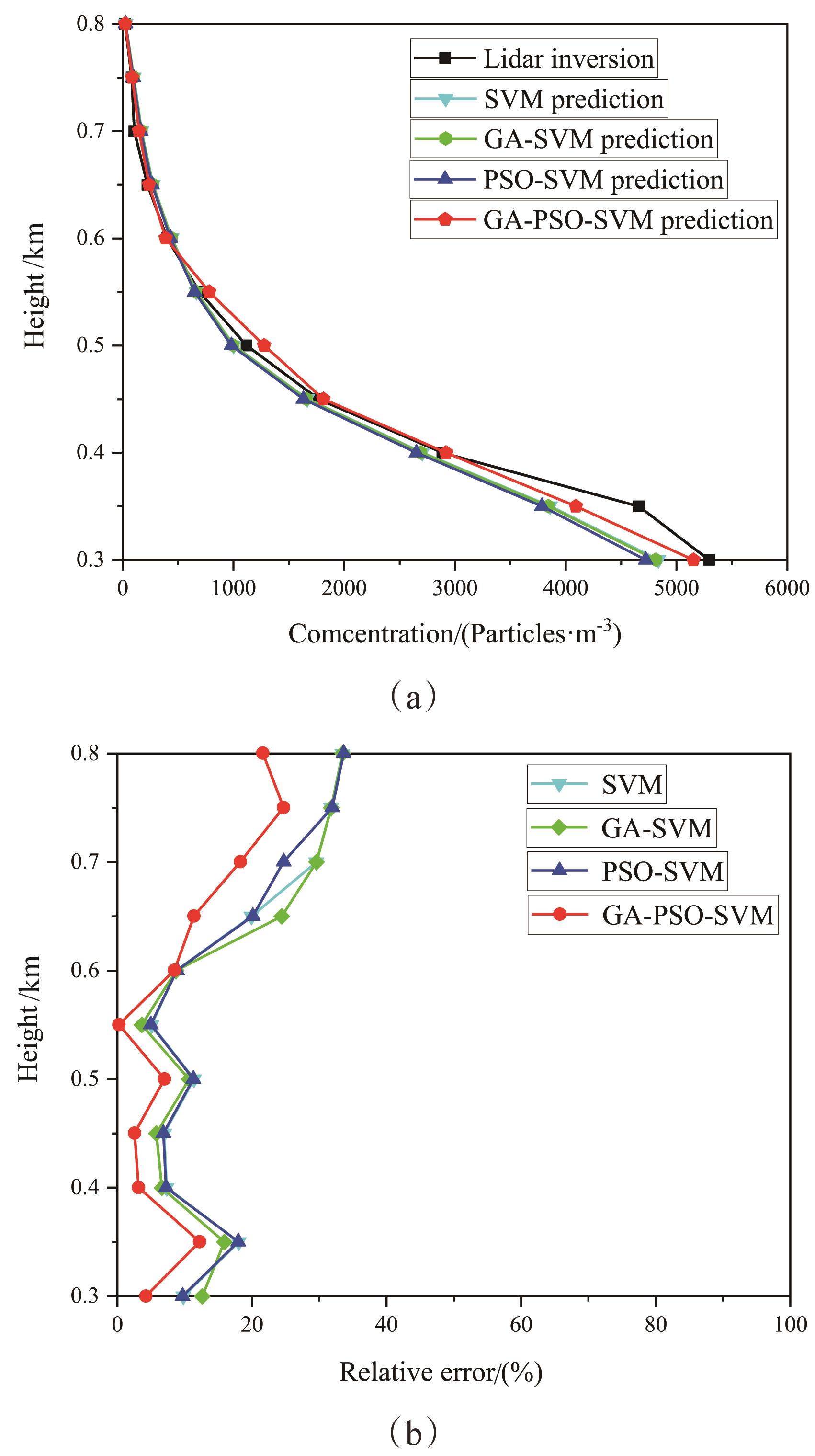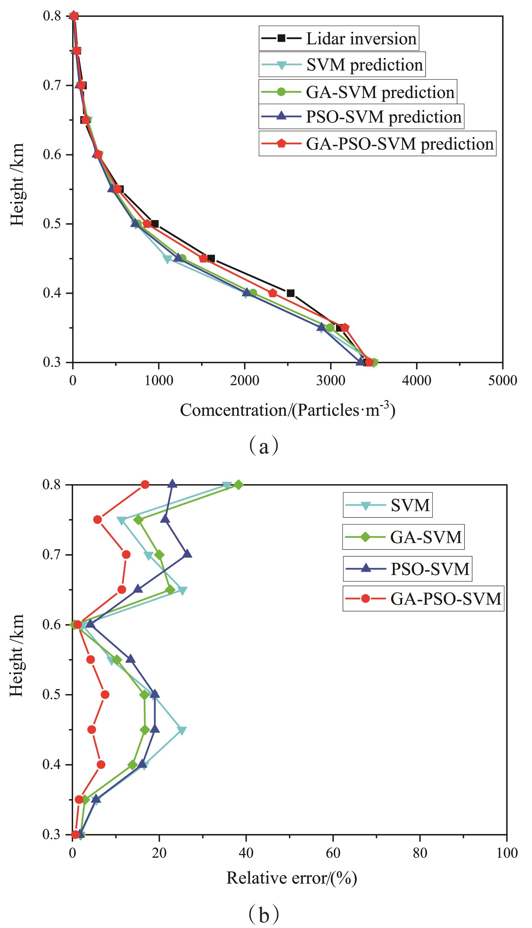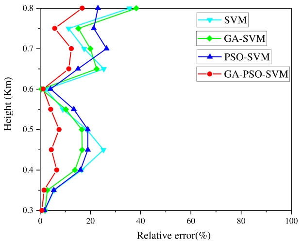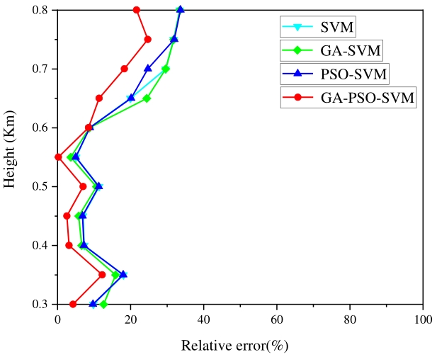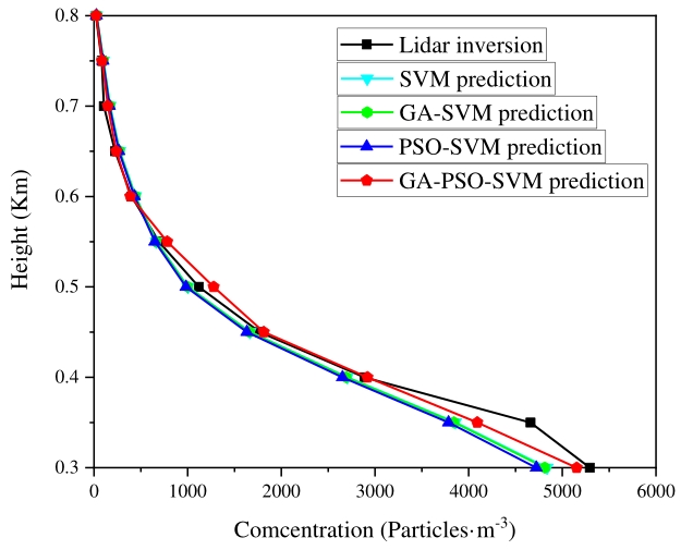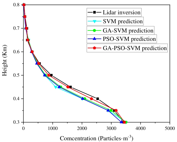 Abstract:Bioaerosol particles spread widely in the air, and high concentrations of bioaerosols pose a great threat to human health. To achieve early warning and prediction of atmospheric bioaerosol concentration, this paper uses fluorescence lidar as the detection tool. Based on the acquisition of bioaerosol concentration profiles, combined with relevant parameters of the atmospheric environment, particle swarm optimization (PSO) and genetic algorithm (GA) are used to optimize the support vector machine (SVM) to establish a bioaerosol concentration profile prediction model. Using temperature, humidity, PM2.5, PM10, CO2, SO2, NO2, O3, wind speed and other related parameter data as inputs, and bioaerosol concentration profile data as outputs for model training, the prediction model parameter configuration is determined. New atmospheric environment parameters are reintroduced, and the trained model is used to predict the bioaerosol concentration profile, which is compared with the bioaerosol concentration profile detected by fluorescence lidar. At the same time, different algorithms are analyzed to optimize the model''s predicted bioaerosol concentration and its relative error.
