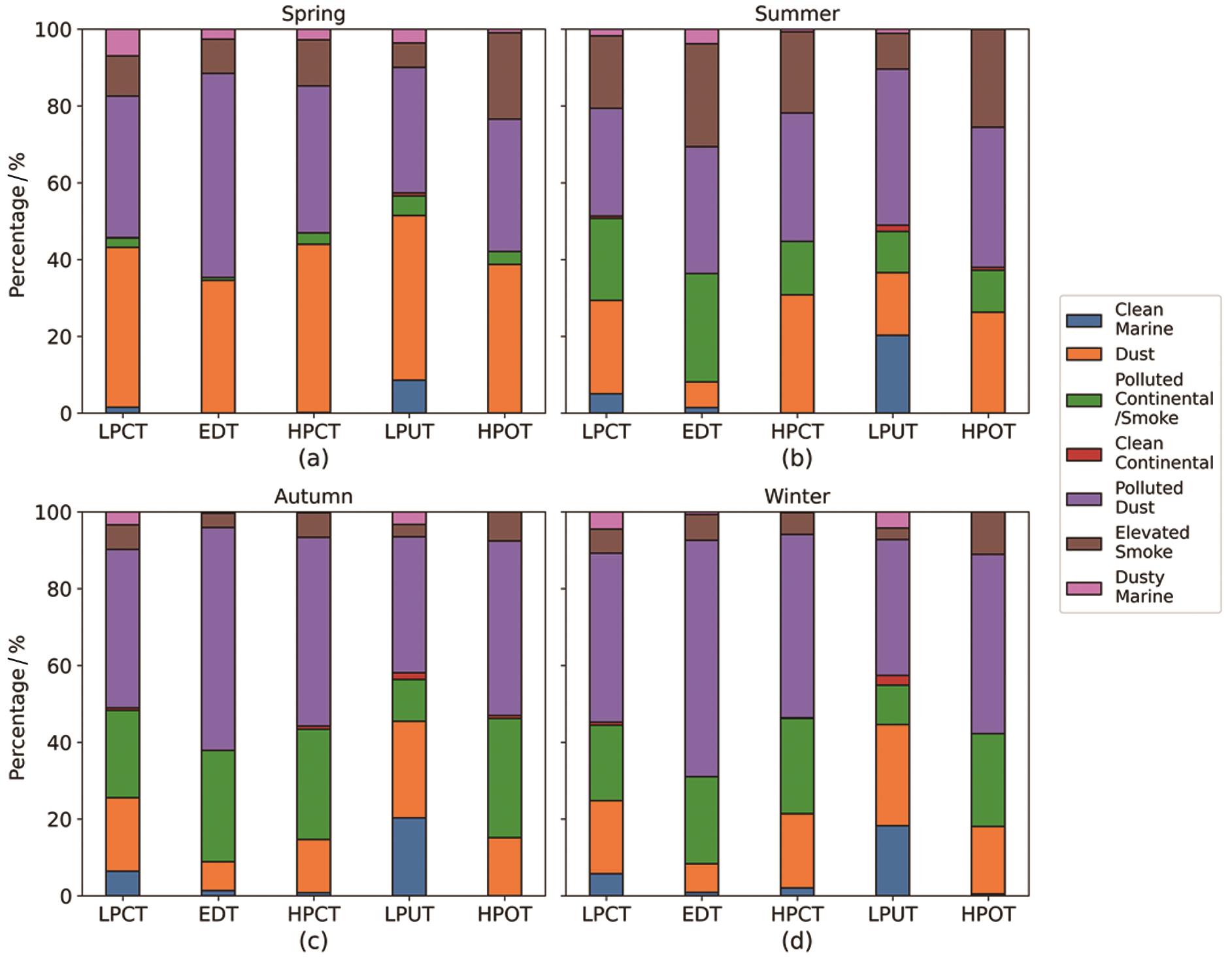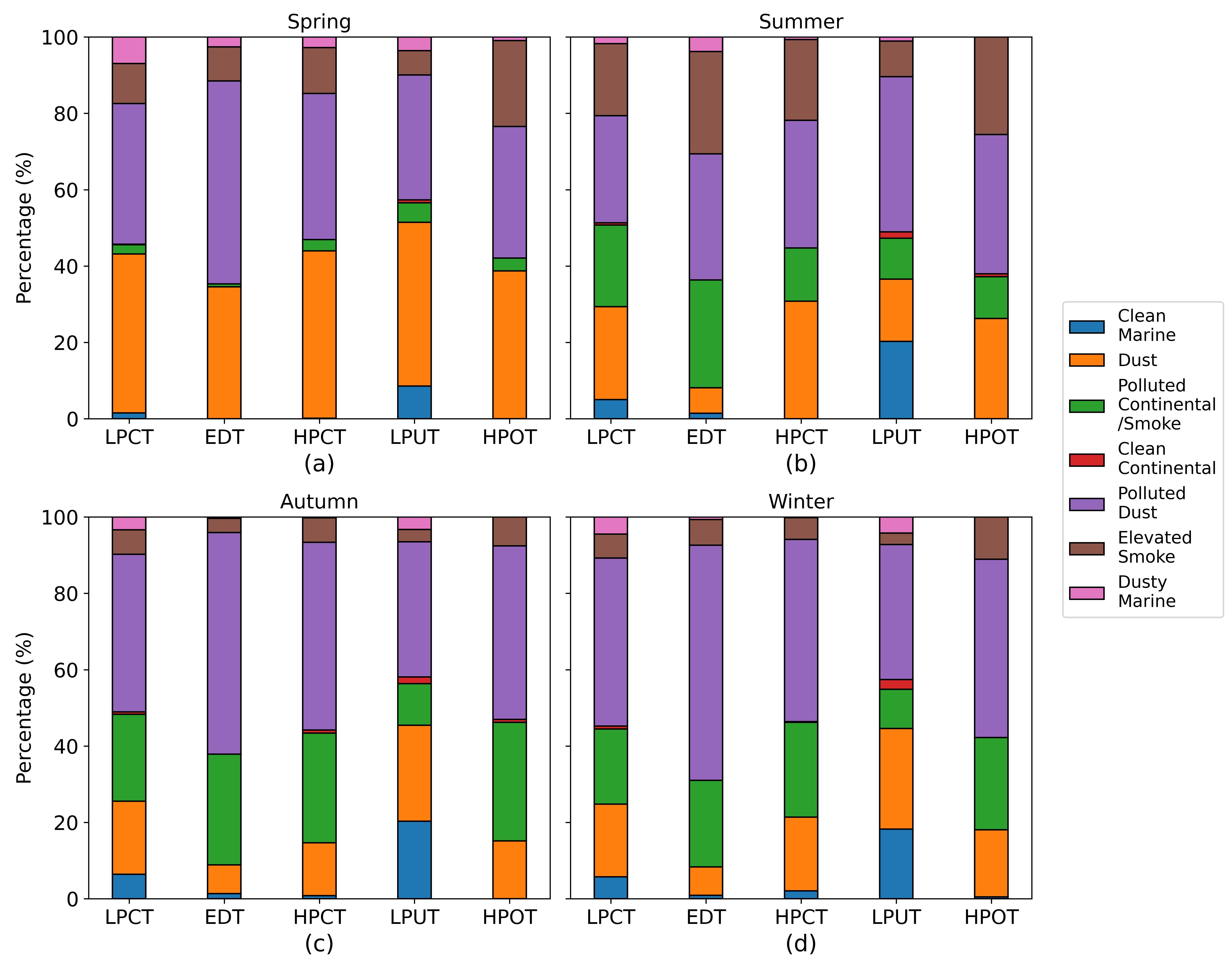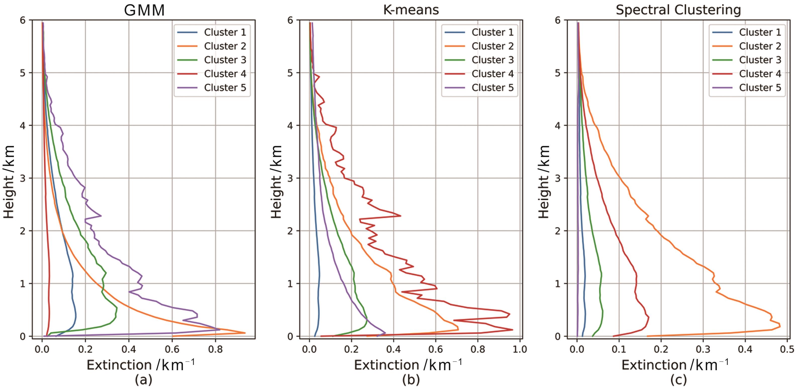 Abstract:The vertical distribution of aerosols plays a critical role in improving the accuracy of aerosol retrieval in satellite remote sensing due to its complexity and spatiotemporal variability. This study investigated the vertical characteristics of aerosols using unsupervised clustering methods, based on CALIOP (Cloud-Aerosol Lidar with Orthogonal Polarization) Level 3 aerosol profile data from 2010 to 2020. Three clustering algorithms—Gaussian Mixture Model (GMM), K-means, and spectral clustering—were evaluated using multiple performance metrics. The profiles of extinction coefficients were clustered into five representative types using the GMM algorithm: low-pollution composite type, high-pollution composite type, exponential decay type, low-pollution uniform type, and high-pollution oscillatory type. The seasonal and regional distributions of these profile types were further analyzed over the Tibetan Plateau, the Beijing-Tianjin-Hebei region, and the Yangtze River Delta. The results show that aerosol vertical profiles exhibit distinct seasonal and regional patterns. These findings provide a basis for improving aerosol profile parameterization and retrieval accuracy in remote sensing applications.