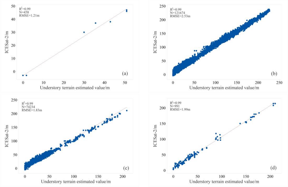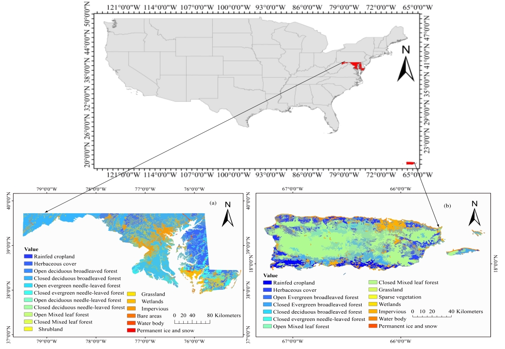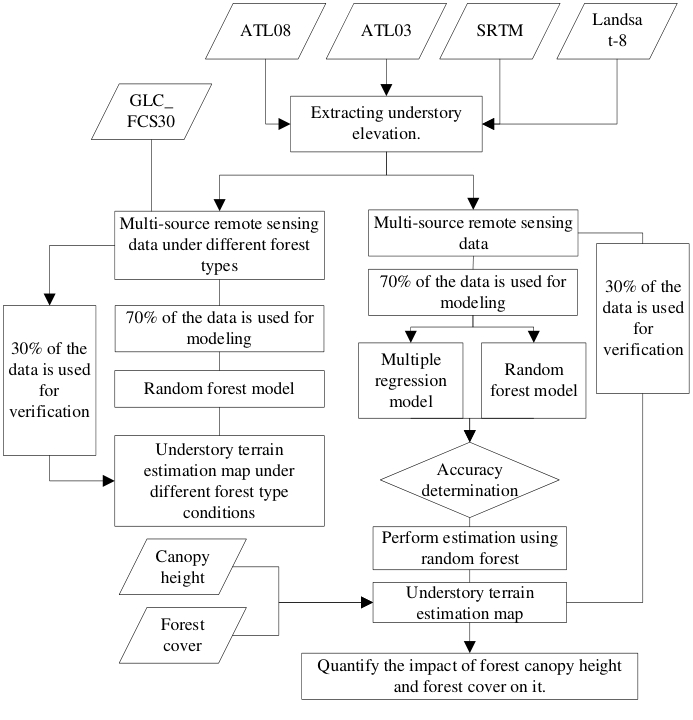 Abstract:Accurate estimation of understory terrain has significant scientific importance for maintaining ecosystem balance and biodiversity conservation. Addressing the issue of inadequate representation of spatial heterogeneity when traditional forest topographic inversion methods consider the entire forest as the inversion unit, this study proposes a differentiated modeling approach to forest types based on refined land cover classification. Taking Puerto Rico and Maryland as study areas, a multi-dimensional feature system is constructed by integrating multi-source remote sensing data: ICESat-2 spaceborne LiDAR is used to obtain benchmark values for understory terrain, topographic factors such as slope and aspect are extracted based on SRTM data, and vegetation cover characteristics are analyzed using Landsat-8 multispectral imagery. This study incorporates forest type as a classification modeling condition and applies the random forest algorithm to build differentiated topographic inversion models. Experimental results indicate that, compared to traditional whole-area modeling methods (RMSE=5.06 m), forest type-based classification modeling significantly improves the accuracy of understory terrain estimation (RMSE=2.94 m), validating the effectiveness of spatial heterogeneity modeling. Further sensitivity analysis reveals that canopy structure parameters (with RMSE variation reaching 4.11 m) exert a stronger regulatory effect on estimation accuracy compared to forest cover, providing important theoretical support for optimizing remote sensing models of forest topography.