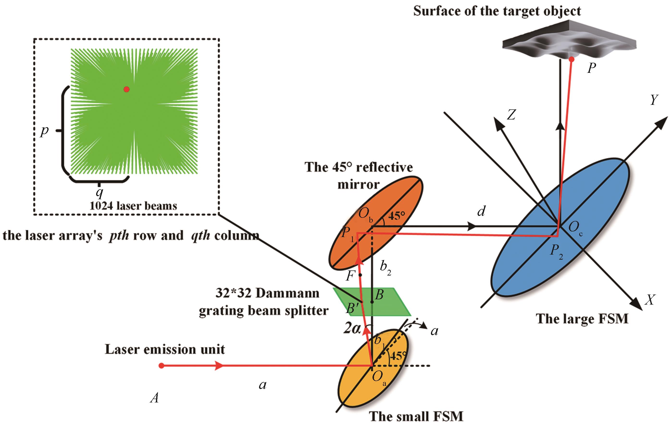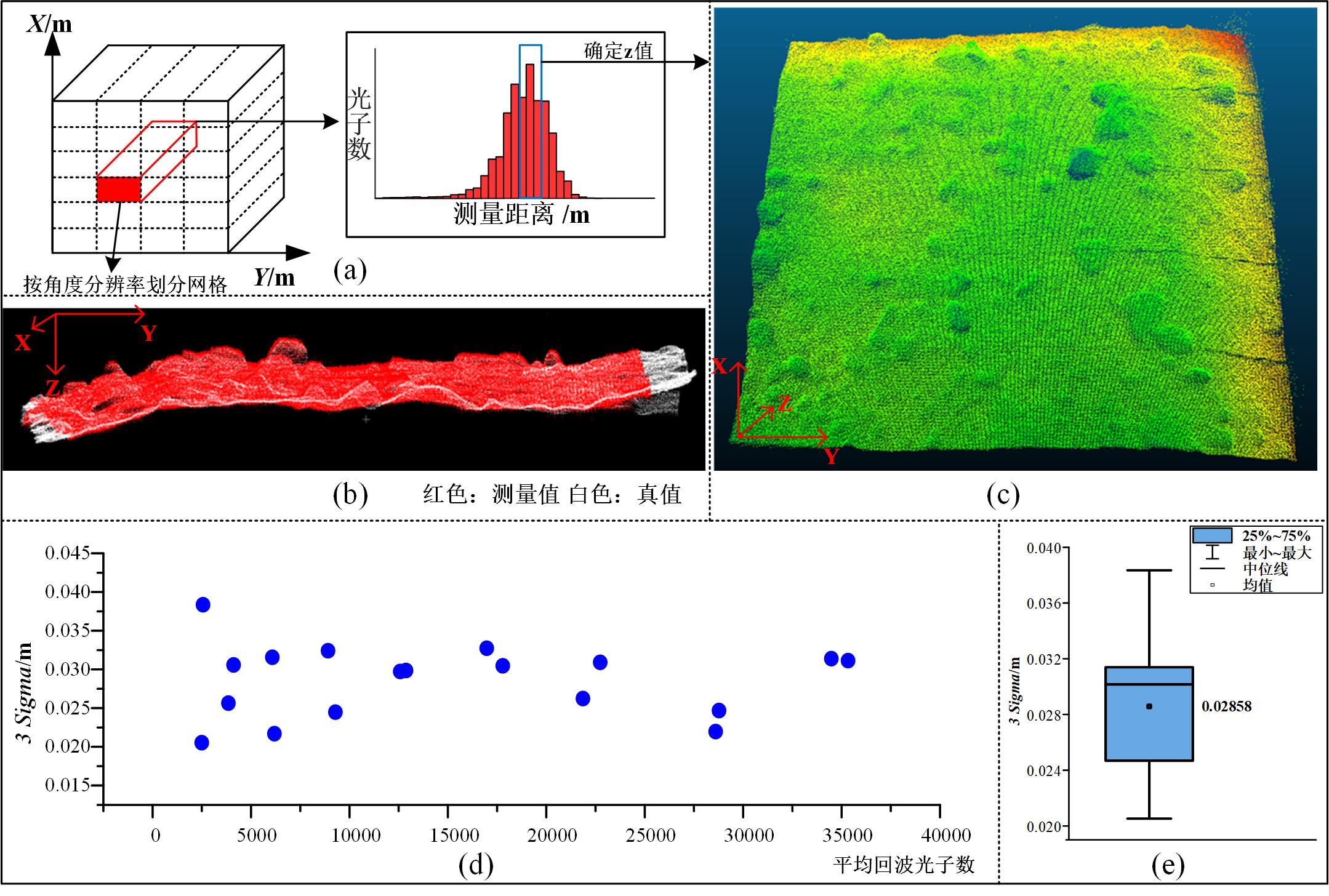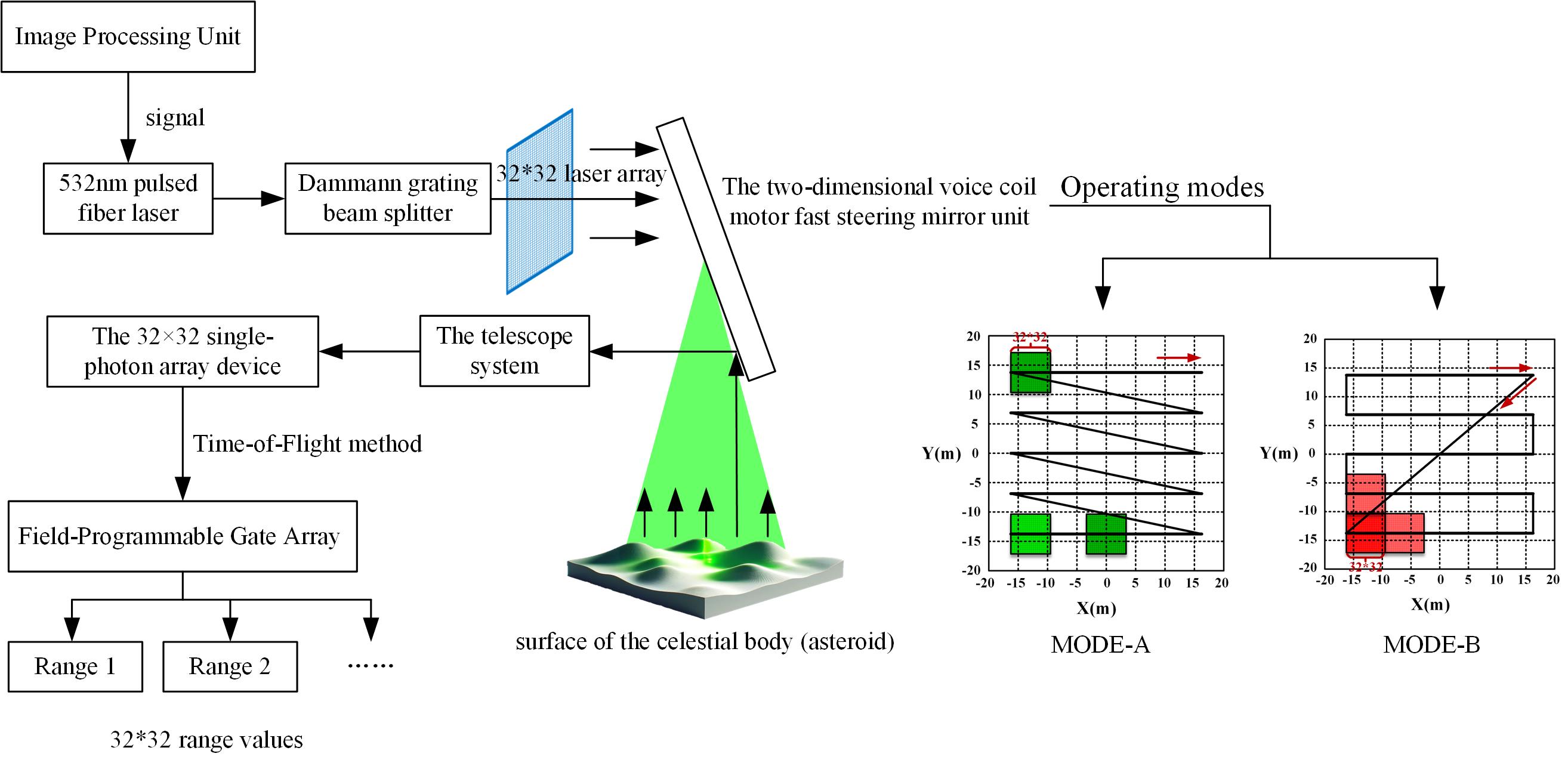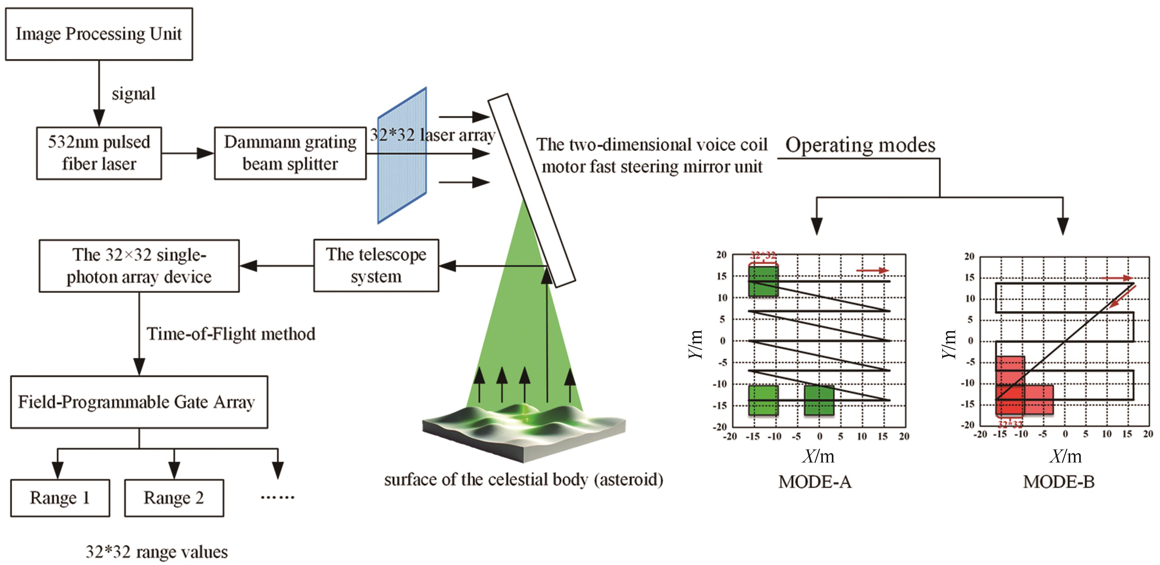 Abstract:A hybrid solid-state LiDAR system specifically designed for detecting rapidly rotating small celestial bodies was introduced. The ranging principle was analyzed and an imaging model was designed based on the characteristics of the fast steering mirrors and the single-photon array detector. To evaluate the performance and stability of the LiDAR system in small celestial body detection, a mapping validation method based on an outdoor terrain model simulating small celestial body features was proposed. The results show that the hybrid solid-state LiDAR system maintains high accuracy under different operating modes and power levels. In the global terrain mapping mode, the resolution was 1 100×1 100, and the imaging time was 0.86 s. The mapping accuracy was 2.86 cm at a distance of 100 m. In the step-scanning imaging mode, the resolution was approximately one-seventh that of the global terrain mapping mode, and the average accuracy reached 3.10 cm at distances ranging from 34 m to 83 m.