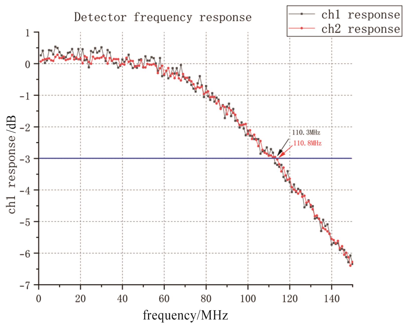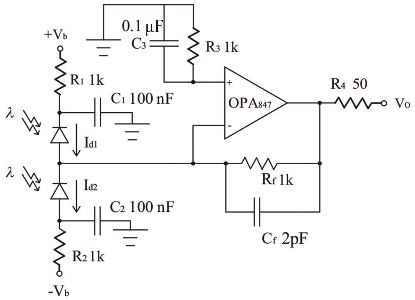 Abstract:Despite rapid advancements in lidar technology, extremely long-range observation remains a significant challenge. Recently, 2 μm lasers have demonstrated a potential to be applied in CDWL(Coherent Doppler Wind Lidar) system, for its high atmospheric penetration capability through the atmosphere and high potential laser power. In this study, we present a 2 μm balanced detector that consists of a pair of commercial positive-intrinsic-negative (PIN) diodes with a low-noise transimpedance circuit. To meet the high bandwidth requirements, the highspeed transimpedance circuit and bias voltage tuning method were utilized to overcome the large capacitance of PIN diodes. The circuit transfer function, stability analysis and noise calculation have been studied. The detector was co-packaged with a data acquisition module for convenient data transmission and bias voltage control. The characteristics of the detector, including bandwidth, noise and bias voltage influence, are evaluated in laboratory. Results show that the RMS value of the balanced detector background noise is 539 μV and the bandwidths of the two diodes are 110.8 MHz and 110.3 MHz, respectively. The evaluation results show that the balanced detector meets the wind measurement requirements and allows for a 1.45× increase in bandwidth through bias voltage tuning. Our work offers insights into lidar detector design and bandwidth enhancement, providing a valuable reference for researchers and professionals in the field. More importantly, it lays a critical foundation for future ultra-long-range and space-borne 2 μm coherent wind lidar systems by addressing key device-level challenges.