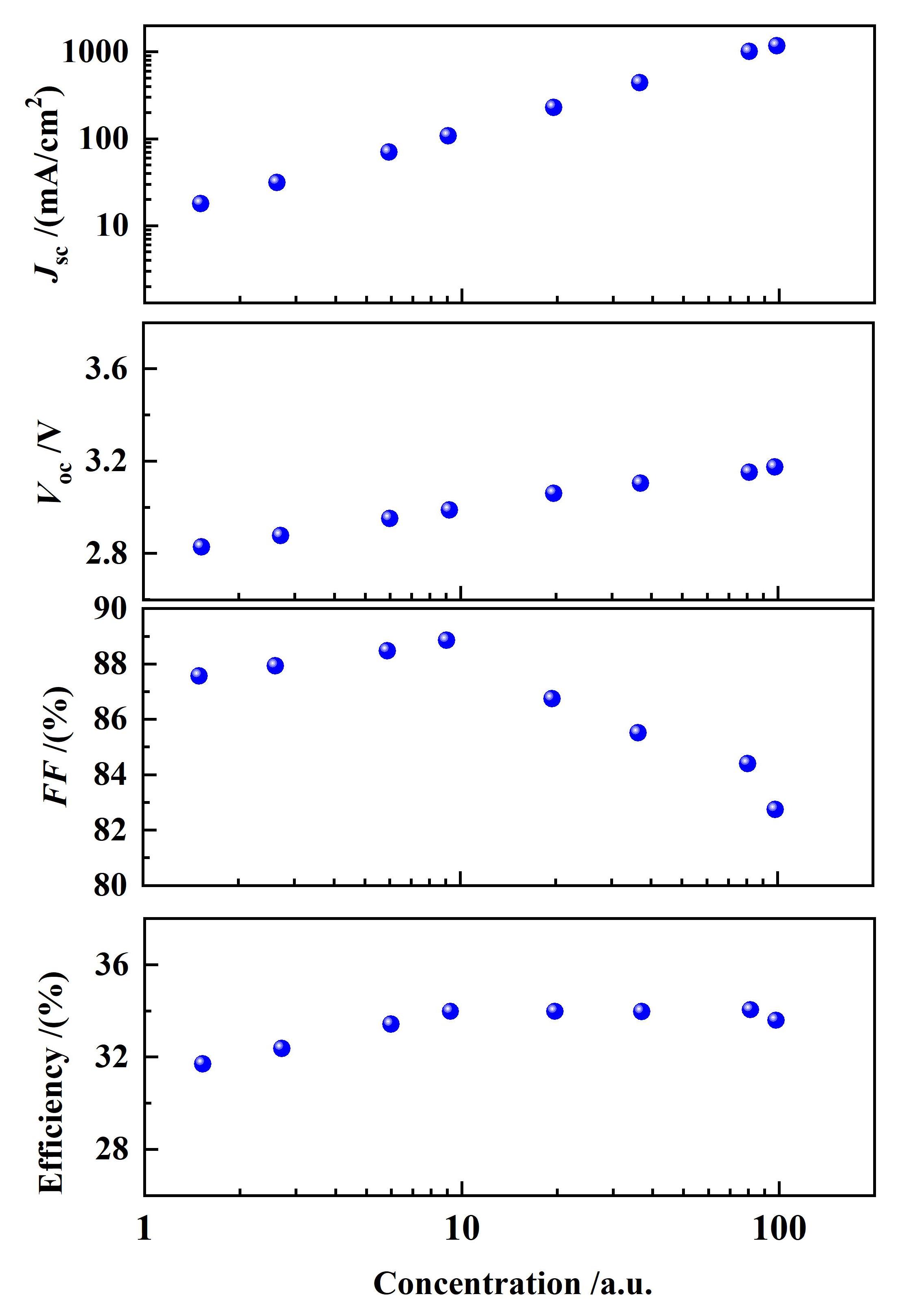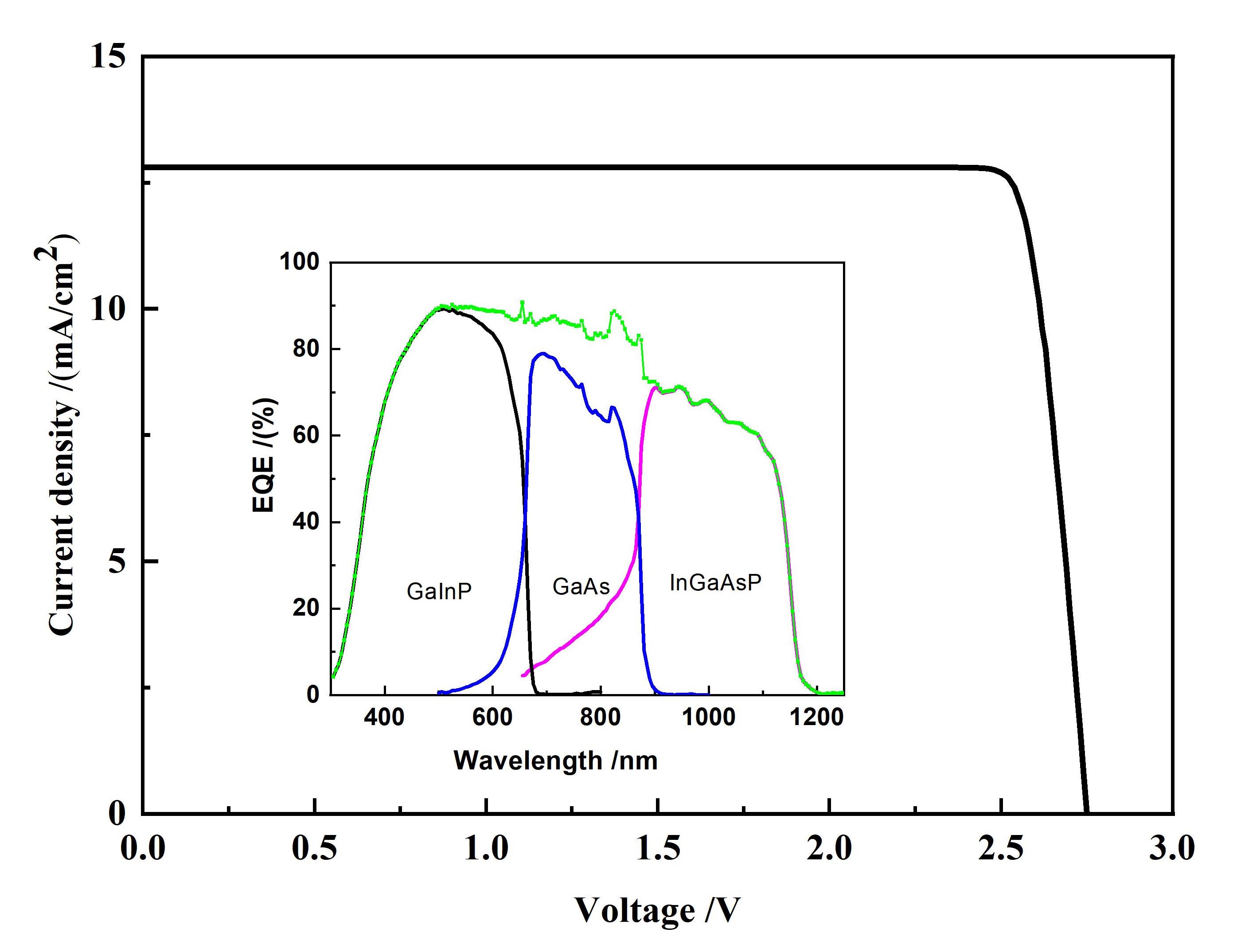 Abstract:The InGaAsP material with an energy bandgap of 1.05 eV was grown on InP substrate by all-solid-state Molecular Beam Epitaxy (MBE) technique. The material had no mismatch dislocations between the substrate and the epitaxial layer, and also exhibited high interface quality and luminescence quality. Based on InGaAsP material, single-junction InGaAsP solar cells were grown on InP substrates, and GaInP/GaAs dual-junction solar cells were grown on GaAs substrates. These two separate cells were then bonded together using the wafer bonding technology to fabricate a GaInP/GaAs/InGaAsP triple-junction solar cell. Under the AM1.5G solar simulator, the conversion efficiency of the GaInP/GaAs/InGaAsP wafer-bonded solar cell was 30.6%, achieving an efficiency of 34% under concentration. The results indicate that MBE can produce high-quality InGaAsP material, and that room-temperature wafer bonding technology holds great potential for the fabrication of multi-junction solar cells.