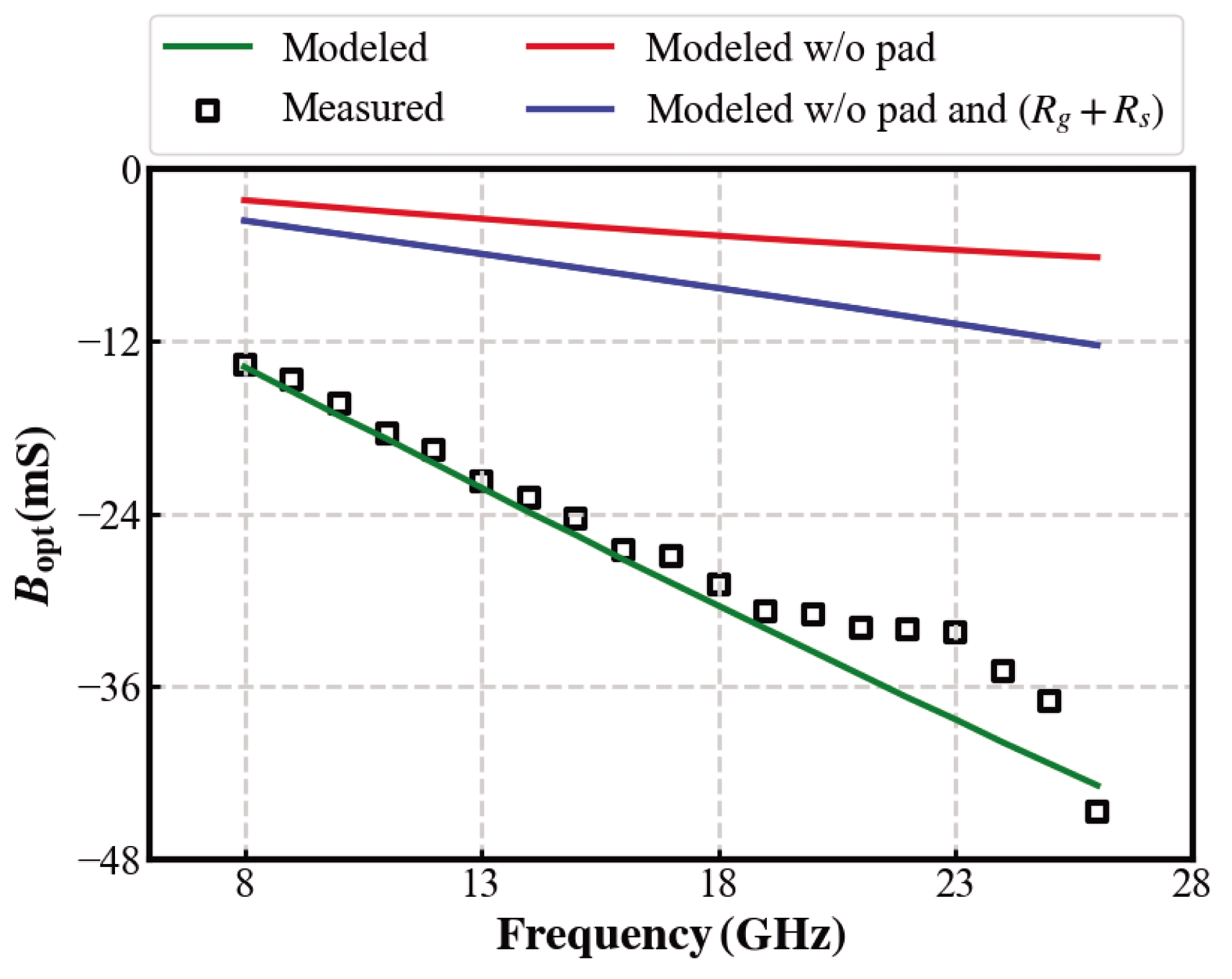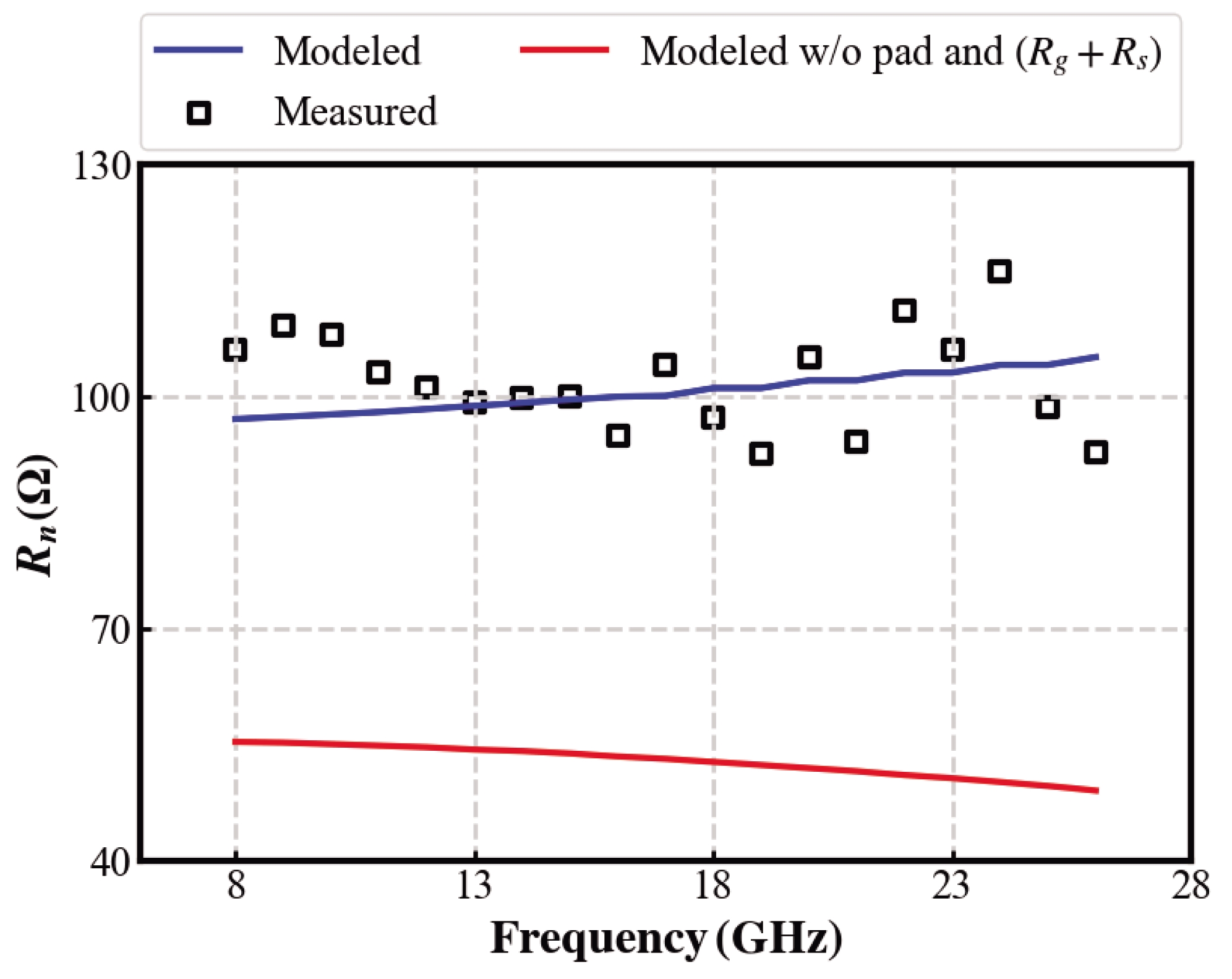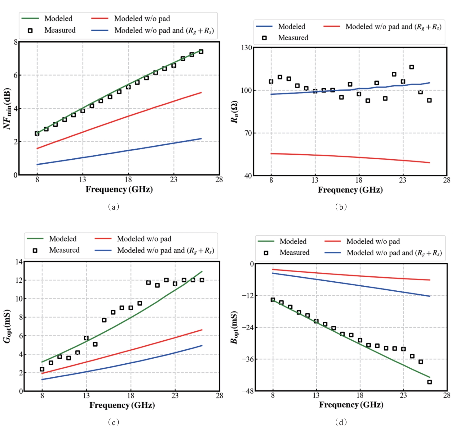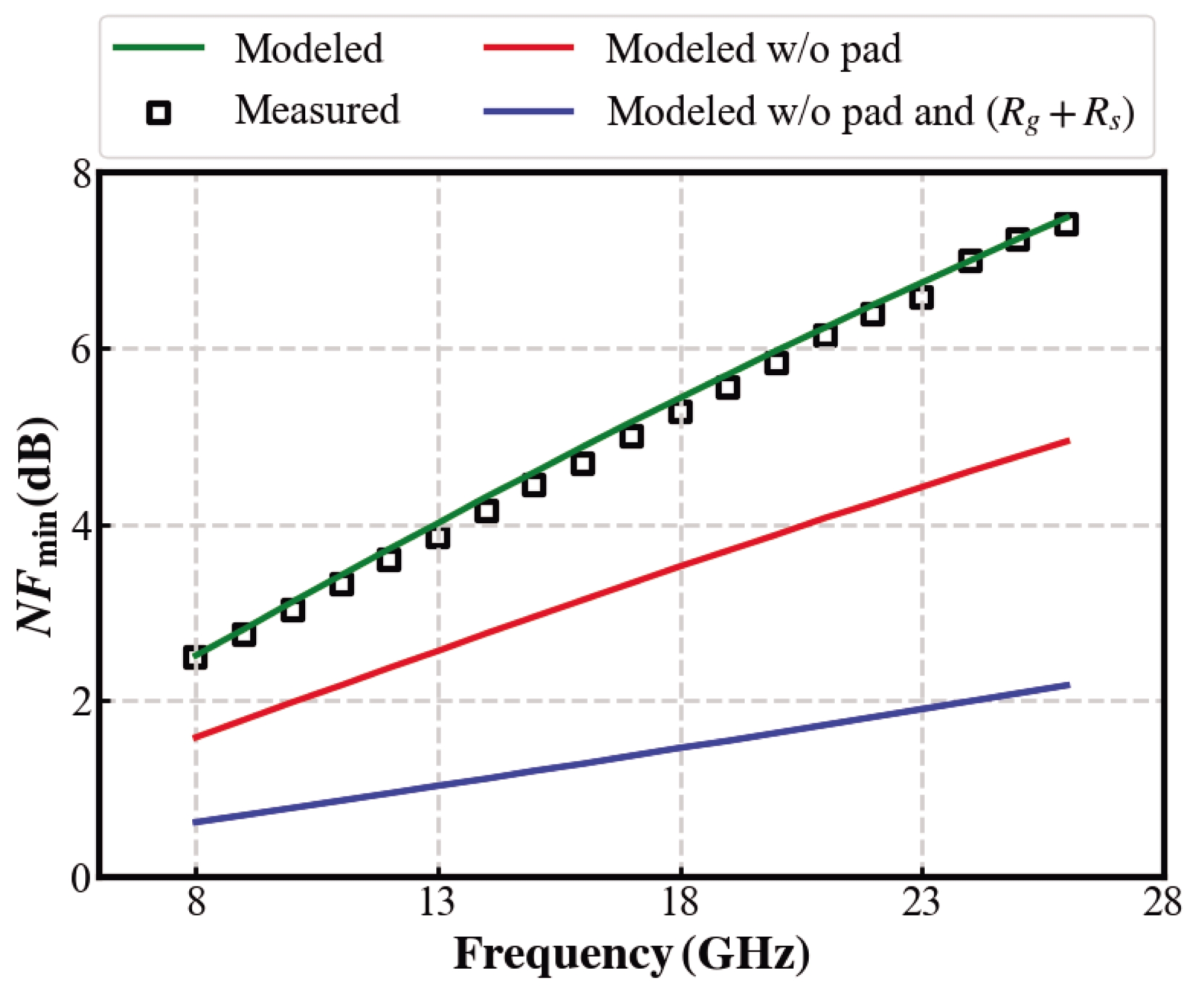 Abstract:This paper investigates the impact of extrinsic resistance on the noise performance of deep submicron MOSFETs (metal-oxide-semiconductor field-effect-transistor) using the noise correlation matrix method. Analytical closed-form expressions for calculating the four noise parameters are derived based on the small-signal and noise-equivalent circuit models. The results show strong agreement between simulated and experimental data for MOSFETs with a gate length of 40 nm and dimensions of 4×5 μm (number of gate fingers × unit gate width.