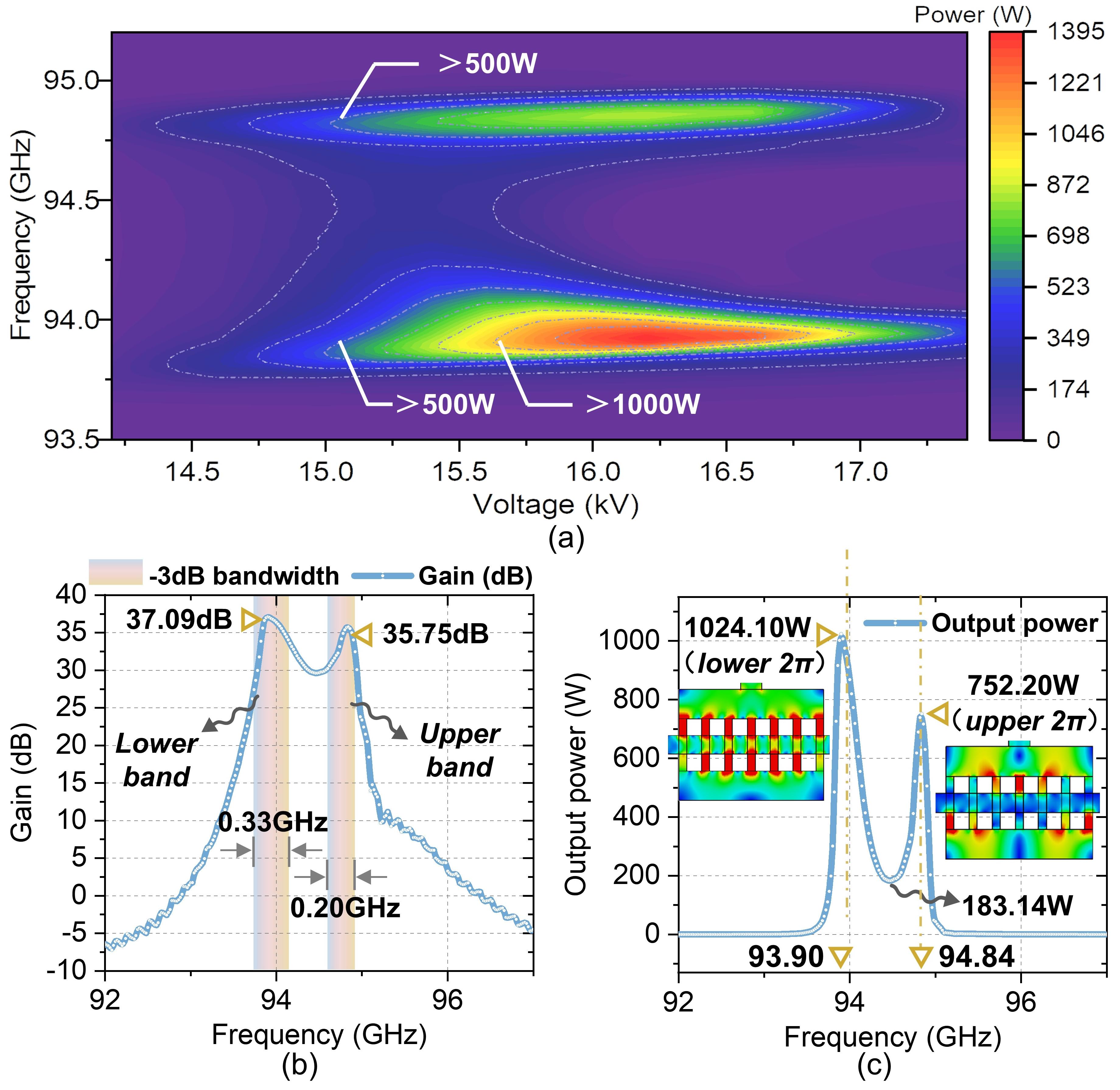 This paper proposes a novel dual-frequency-band millimeter-wave extended interaction klystron amplifier (EIKA). It is primarily based on the multimode operating mechanism of dual-2π mode. This design integrates a broadband traveling-standing-wave mode input cavity with a dual-2π standing-wave mode output cavity, resulting in a compact slow-wave structure design that efficiently operates within a total circuit length of approximately 24 mm. Particle-in-cell simulation results reveal that under a 15.6 kV, 1 A electron beam and a uniform 0.6 T magnetic field, the device achieves output power for 183-1024 W across a broadly 1.20 GHz bandwidth, spanning 93.76-94.96 GHz. Remarkably, it facilitates dual-band output in both lower-2π and upper-2π bands, delivering maximum gains of 37.09 dB (1024.10 W at 93.90 GHz) and 35.75 dB (752.20 W at 94.84 GHz), with -3 dB bandwidths of 0.33 GHz and 0.20 GHz, respectively. The effectiveness for the dual-2π mode design is further confirmed through a cold-test experiment using the perturbation method. This experiment demonstrated typical dual-2π mode field distribution profiles, affirming the design''s efficacy.