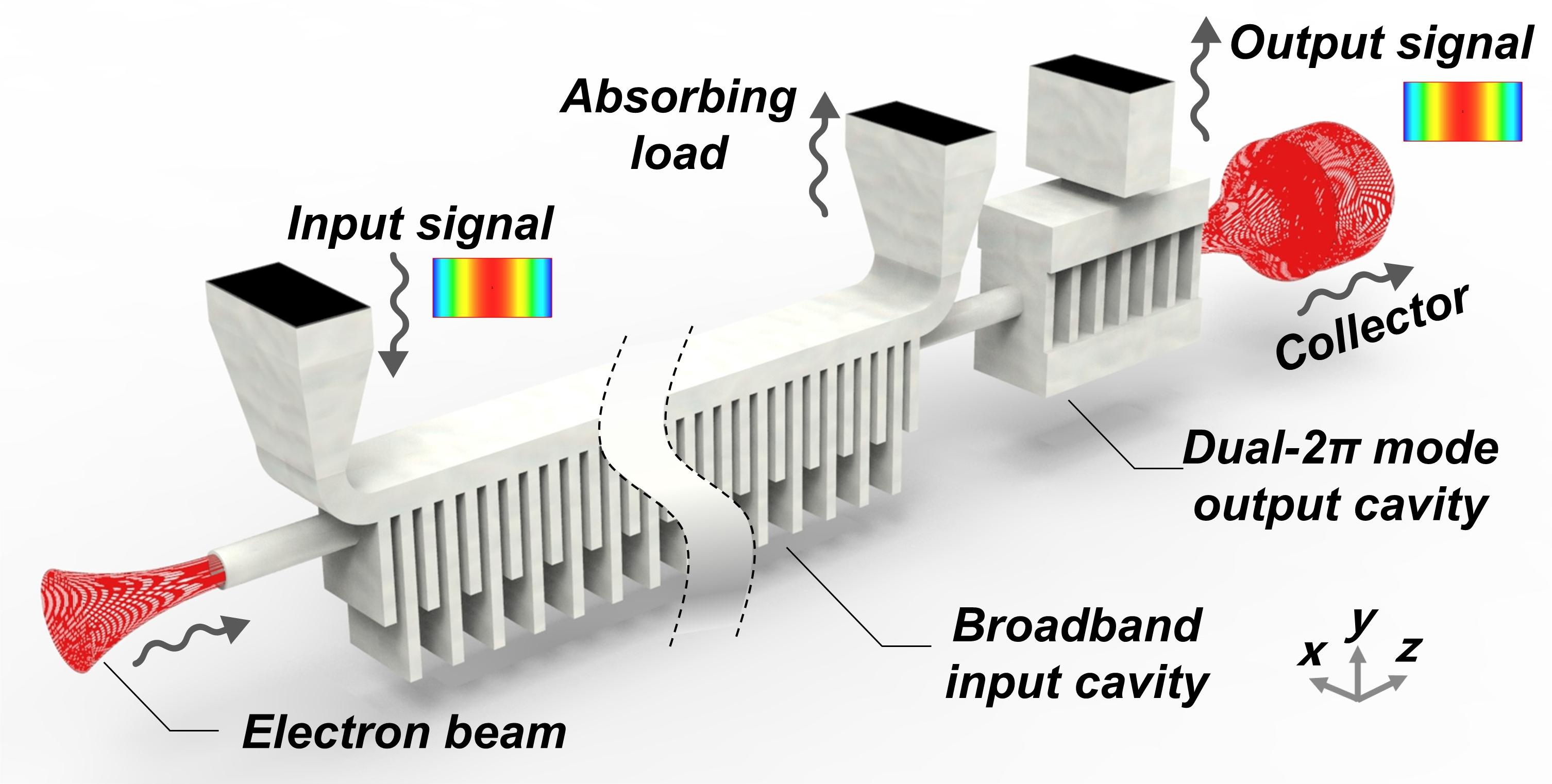 This paper proposes a novel dual-frequency-band millimeter-wave extended interaction klystron amplifier (EIKA). It is primarily based on the multimode operating mechanism of dual-2π mode. This design integrates a broadband traveling-standing-wave mode input cavity with a dual-2π standing-wave mode output cavity, resulting in a compact slow-wave structure design that efficiently operates within a total circuit length of approximately 24 mm. Particle-in-cell simulation results reveal that under a 15.6 kV, 1 A electron beam and a uniform 0.6 T magnetic field, the device achieves output power for 183-1 024 W across a broadly 1.20 GHz bandwidth, spanning 93.76-94.96 GHz. Remarkably, it facilitates dual-band output in both lower-2π and upper-2π bands, delivering maximum gains of 37.09 dB (1 024.10 W at 93.90 GHz) and 35.75 dB (752.20 W at 94.84 GHz), with -3 dB bandwidths of 0.33 GHz and 0.20 GHz, respectively. The effectiveness for the dual-2π mode design is further confirmed through a cold-test experiment using the perturbation method. This experiment demonstrated typical dual-2π mode field distribution profiles, affirming the design''s efficacy.