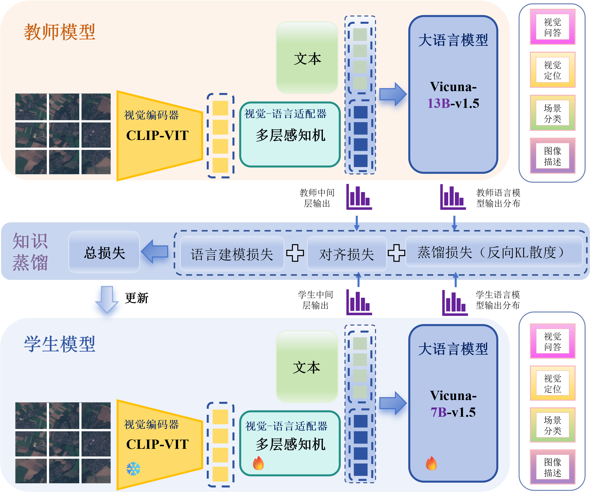 Remote sensing multimodal large language models (MLLMs), which integrate rich visual-linguistic modal information, have shown great potential in areas such as remote sensing image analysis and interpretation. However, existing knowledge distillation methods primarily focus on the compression of unimodal large language models, neglecting the alignment of features across modalities, thus hindering the performance of large language models in cross-modal tasks. To address this issue, a lightweighting method for remote sensing MLLMs based on knowledge distillation is proposed. This method achieves effective alignment of multimodal information by aligning the outputs across modalities at the feature level. By introducing the reverse Kullback-Leibler divergence as the loss function and combining optimization strategies such as teacher mixed sampling and single-step decomposition, the generalization and stability of the student model are further enhanced. Experimental results demonstrate that the proposed method achieves higher accuracy and efficiency in four downstream tasks of remote sensing image scene classification, visual question answering, visual localization, and image description, significantly reducing the number of model parameters and the demand for computational resources, thereby providing a new solution for the efficient application of MLLMs in the field of remote sensing.