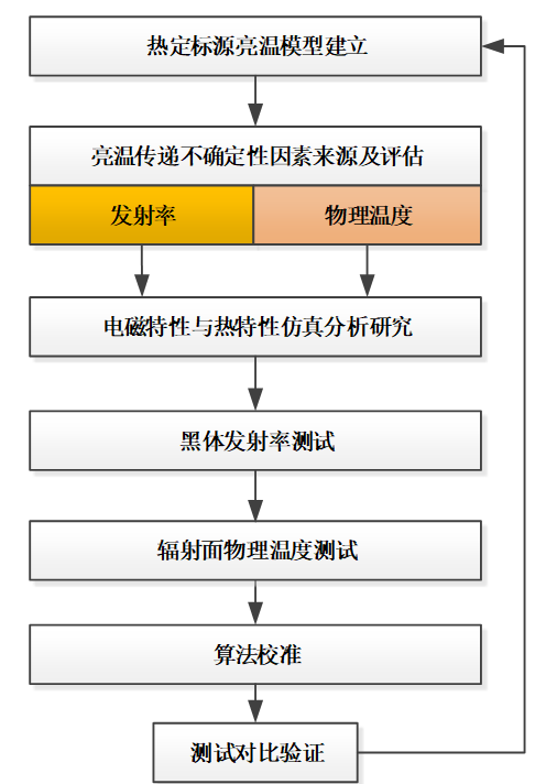Aiming at the application requirements for brightness temperature calibration of spaceborne microwave radiometer thermal calibration targets, based on the temperature gradient characteristics of the absorptive coating and the generation mechanism of brightness temperature bias, and combined with engineering-feasible temperature measurement methods and experimental approaches, this study focuses on researching an on-orbit applicable brightness temperature metrology calibration technical solution. Given the current background of high emissivity design and determination technology of the calibration target being basically perfected, this work focuses on summarizing the methods for determining the temperature gradient characteristics of the calibration target coating. The goal is to construct an in-orbit available brightness temperature calibration method that uses multiple parameters, such as the measurable temperature values of the metal inner core of the calibration target and that near the radiation aperture of the calibration target. Based on feasible electromagnetic simulation technology, thermal simulation technology, platinum resistance and infrared temperature measurement techniques, the paper preliminarily summarizes the implementation path of the brightness temperature calibration technology system for space-borne calibration targets. This involves first constructing a basic brightness temperature calibration model considering uniform background brightness temperature and improving the mapping relationship from the inner core temperature of the calibration target and the equivalent background brightness temperature to the longitudinal temperature gradient of the coating. Subsequently, an application model for brightness temperature calibration considering the installation environment is constructed, improving the mapping relationship from the temperature measurements of the inner core and that of the radiation aperture area of calibration target to the overall brightness temperature deviation. Finally, the validation and application of the brightness temperature calibration model are discussed. The research on brightness temperature calibration of space-borne calibration source is an important technical basis and reference for further improving the accuracy of brightness temperature of calibration target and even developing space microwave radiation measurement standards.