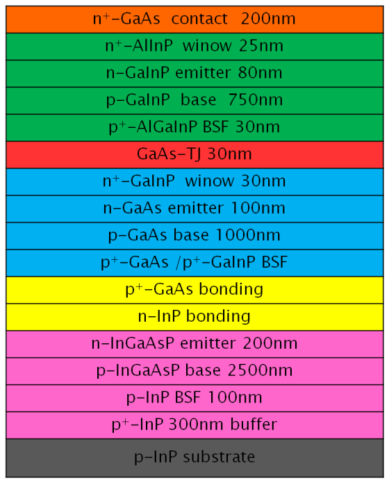 The InGaAsP material with an energy bandgap of 1.05 eV was grown on InP substrate by all-solid-state Molecular Beam Epitaxy (MBE) technique. The material had no mismatch dislocations between the substrate and the epitaxial layer, and also exhibited high interface quality and luminescence quality. Based on InGaAsP material, single-junction InGaAsP solar cells were grown on InP substrates, and GaInP/GaAs dual-junction solar cells were grown on GaAs substrates. These two separate cells were then bonded together using the wafer bonding technology to fabricate a GaInP/GaAs/InGaAsP triple-junction solar cell. Under the AM1.5G solar simulator, the conversion efficiency of the GaInP/GaAs/InGaAsP wafer-bonded solar cell was 30.6%, achieving an efficiency of 34% under concentration. The results indicate that MBE can produce high-quality InGaAsP material, and that room-temperature wafer bonding technology holds great potential for the fabrication of multi-junction solar cells.