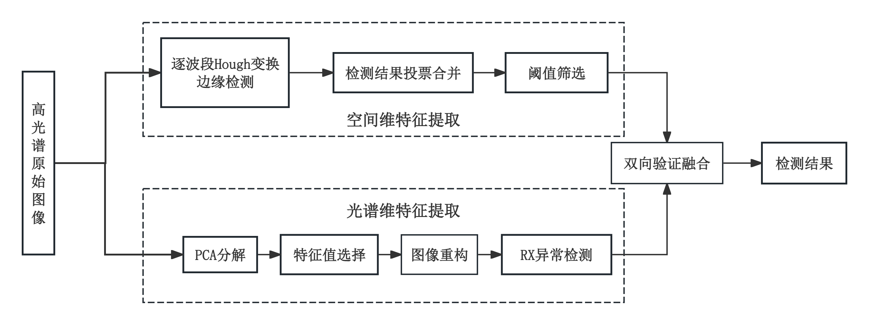 Aircraft contrail detection remains crucial for maintaining airspace safety and addressing the greenhouse effects caused by the aviation industry. Existing methods for detecting aircraft contrails primarily relied on the radiance or temperature differences between specific channels in multispectral images. But they did not fully exploit the potential of spectral features. The advancement of satellite-borne hyperspectral imaging technology has provided a new data foundation for aircraft contrail detection. However, methods that rely solely on either the spatial or spectral dimension of the image are unlikely to achieve satisfactory results in the task of aircraft contrail detection using satellite-based hyperspectral imagery. Therefore, a detection algorithm for potential aircraft contrails was explored using shortwave infrared hyperspectral images from the GF-5 AHSI. A spatial-spectral feature extraction method was proposed, which utilized the complementary nature of spatial and spectral information in hyperspectral images. The method achieved an accuracy of over 97% and a false alarm rate of less than 2% on GF-5 hyperspectral image data. It not only provides an innovative technical approach for aircraft contrail detection, but also offers valuable insights for future researchers and promotes further development of hyperspectral imaging in practical applications.
