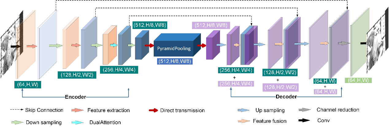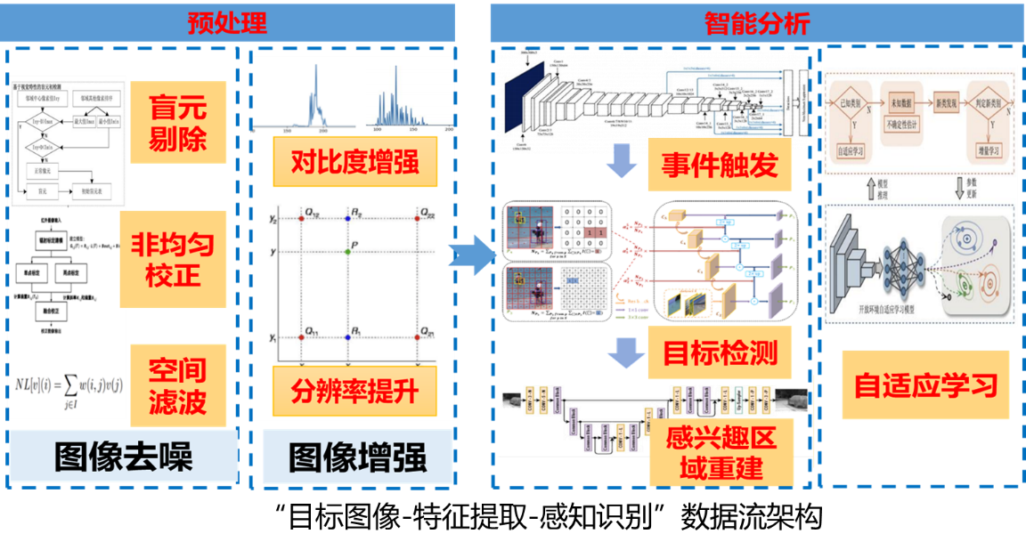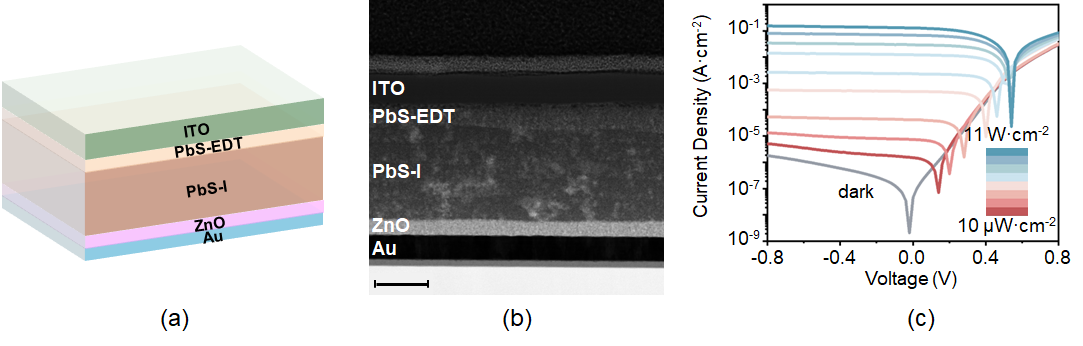 Near-infrared image sensors are widely used in fields such as material identification, machine vision, and autonomous driving. Lead sulfide colloidal quantum dot-based infrared photodiodes can be integrated with silicon-based readout circuits in a single step. Based on this, we propose a photodiode based on an n-i-p structure, which removes the buffer layer and further simplifies the manufacturing process of quantum dot image sensors, thus reducing manufacturing costs. Additionally, for the noise complexity in quantum dot image sensors when capturing images, traditional denoising and non-uniformity methods often do not achieve optimal denoising results. For the noise and stripe-type non-uniformity commonly encountered in infrared quantum dot detector images, a network architecture has been developed that incorporates multiple key modules. This network combines channel attention and spatial attention mechanisms, dynamically adjusting the importance of feature maps to enhance the ability to distinguish between noise and details. Meanwhile, the residual dense feature fusion module further improves the network''s ability to process complex image structures through hierarchical feature extraction and fusion. Furthermore, the pyramid pooling module effectively captures information at different scales, improving the network''s multi-scale feature representation ability. Through the collaborative effect of these modules, the network can better handle various mixed noise and image non-uniformity issues. Experimental results show that it outperforms the traditional U-Net network in denoising and image correction tasks.