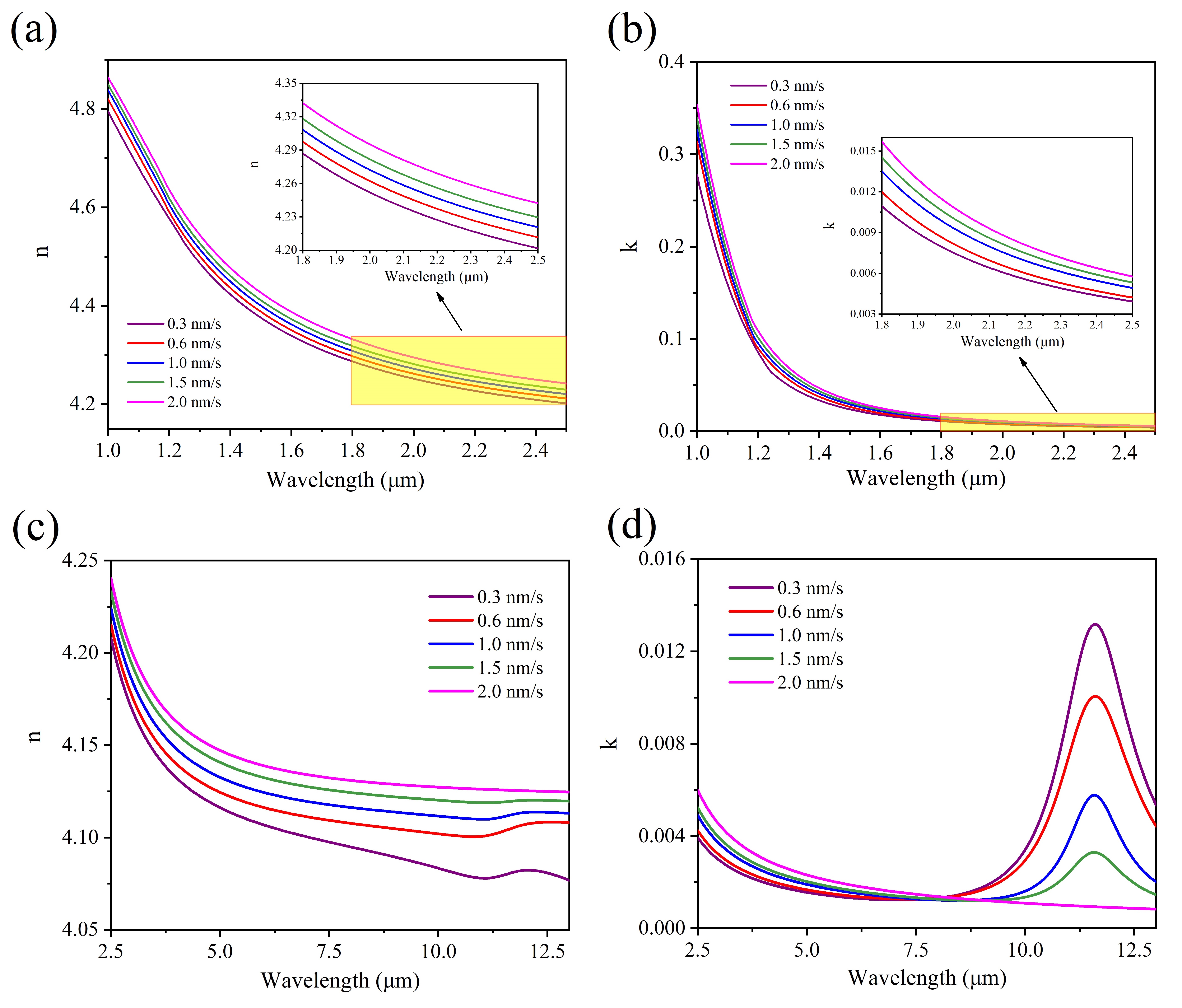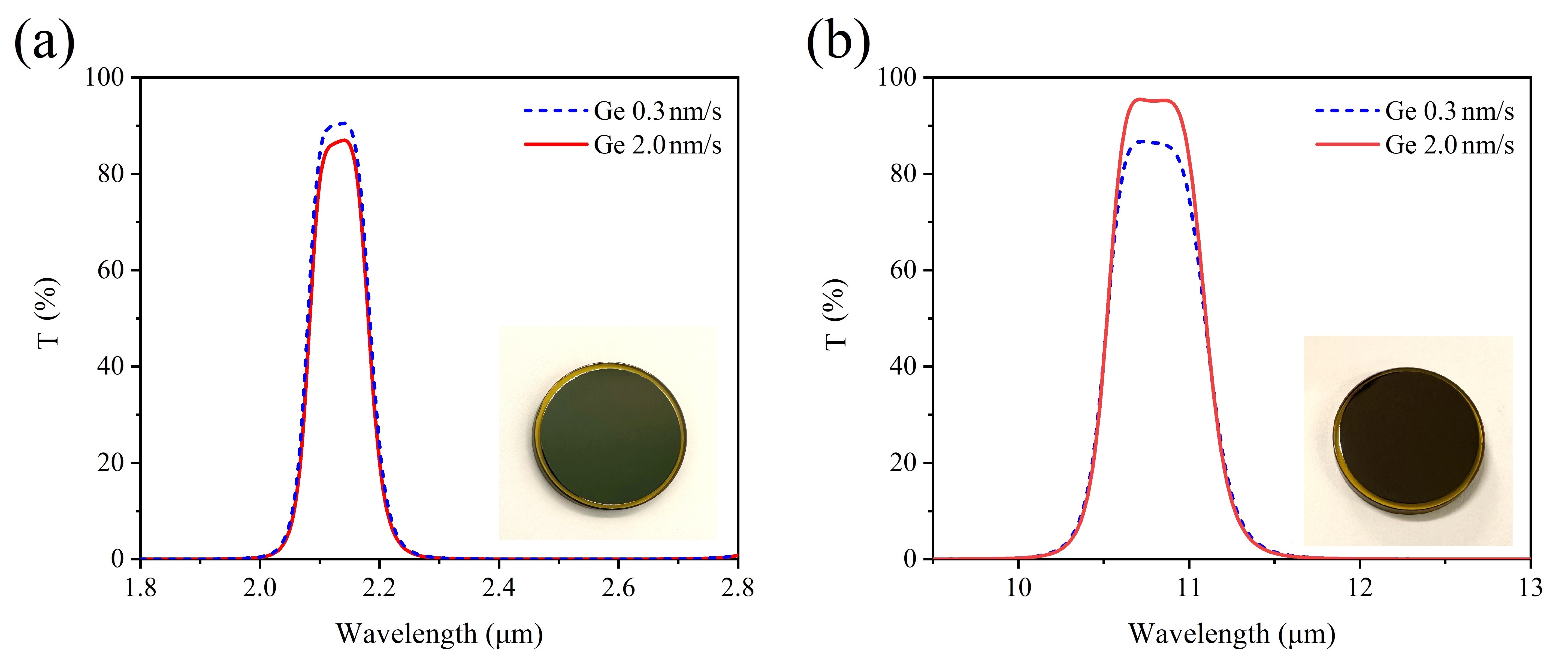 This study systematically investigated the influence of deposition rate on the structure, broadband optical properties (1.0-13.0 μm), and stress characteristics of Germanium (Ge) films. Additionally, a method for enhancing the performance of infrared filters based on rate-modulated deposition of Ge films was proposed. The optical absorption of Ge films in the short-wave infrared (SWIR) and long-wave infrared (LWIR) bands can be effectively reduced by modulating the deposition rate. As the deposition rate increases, the Ge films maintain an amorphous structure. The optical constants of the films in the 1.0-2.5 μm and 2.5-13.0 μm bands were precisely determined using the Cody-Lorentz model and the classical Lorentz oscillator model, respectively. Notably, higher deposition rates result in a gradual increase in the refractive index. The extinction coefficient increases with the deposition rate in the SWIR region, attributed to the widening of the Urbach tail, while it decreases in the LWIR region due to the reduced absorption caused by the Ge-O stretching mode. Additionally, the films exhibit a tensile stress that decreases with increasing deposition rate. Finally, the effectiveness of the proposed fabrication method for an infrared filter with Ge films deposited at an optimized rate was demonstrated through practical examples. This work provides theoretical and technical support for the application of Ge films in high-performance infrared filters.